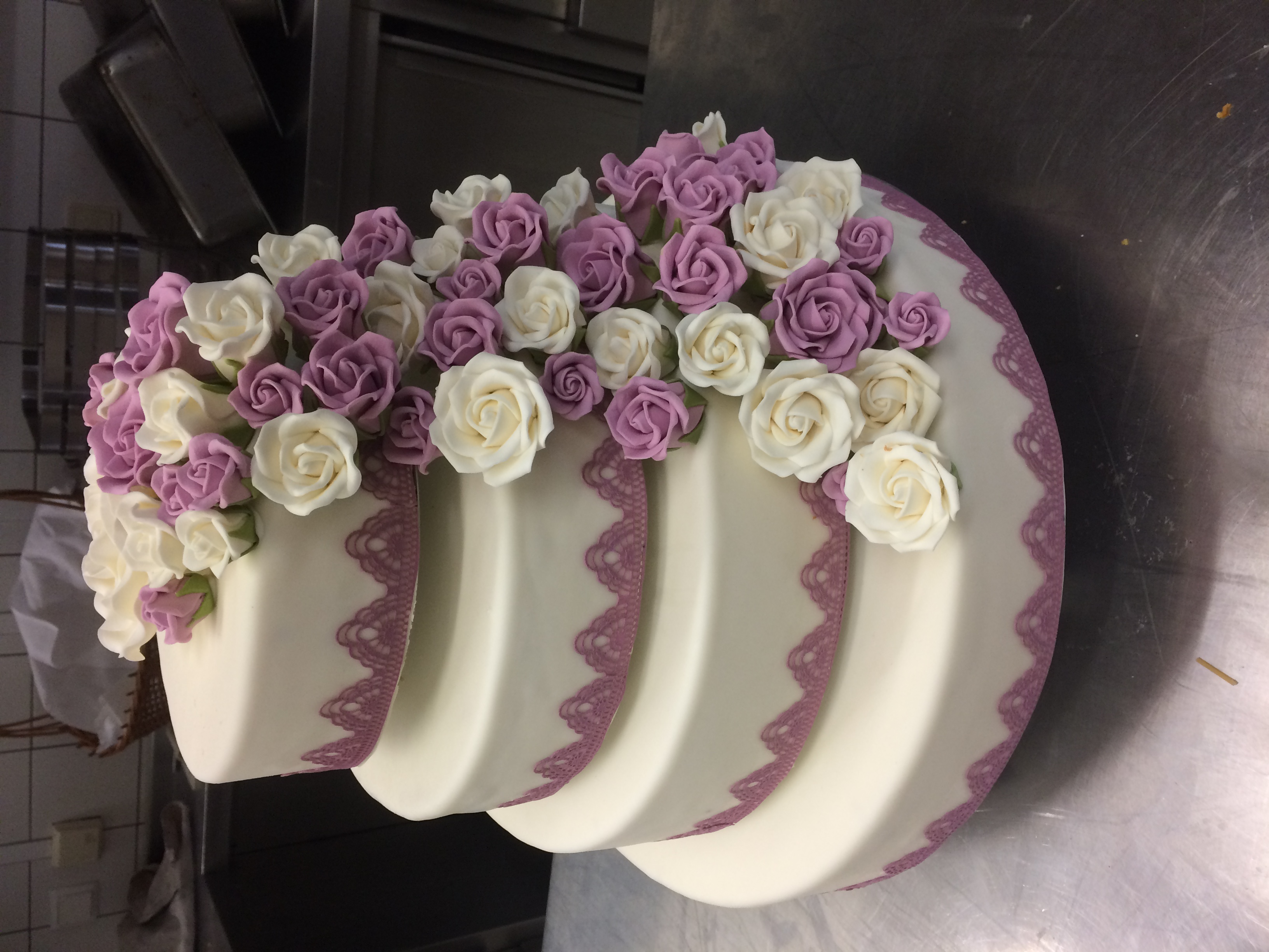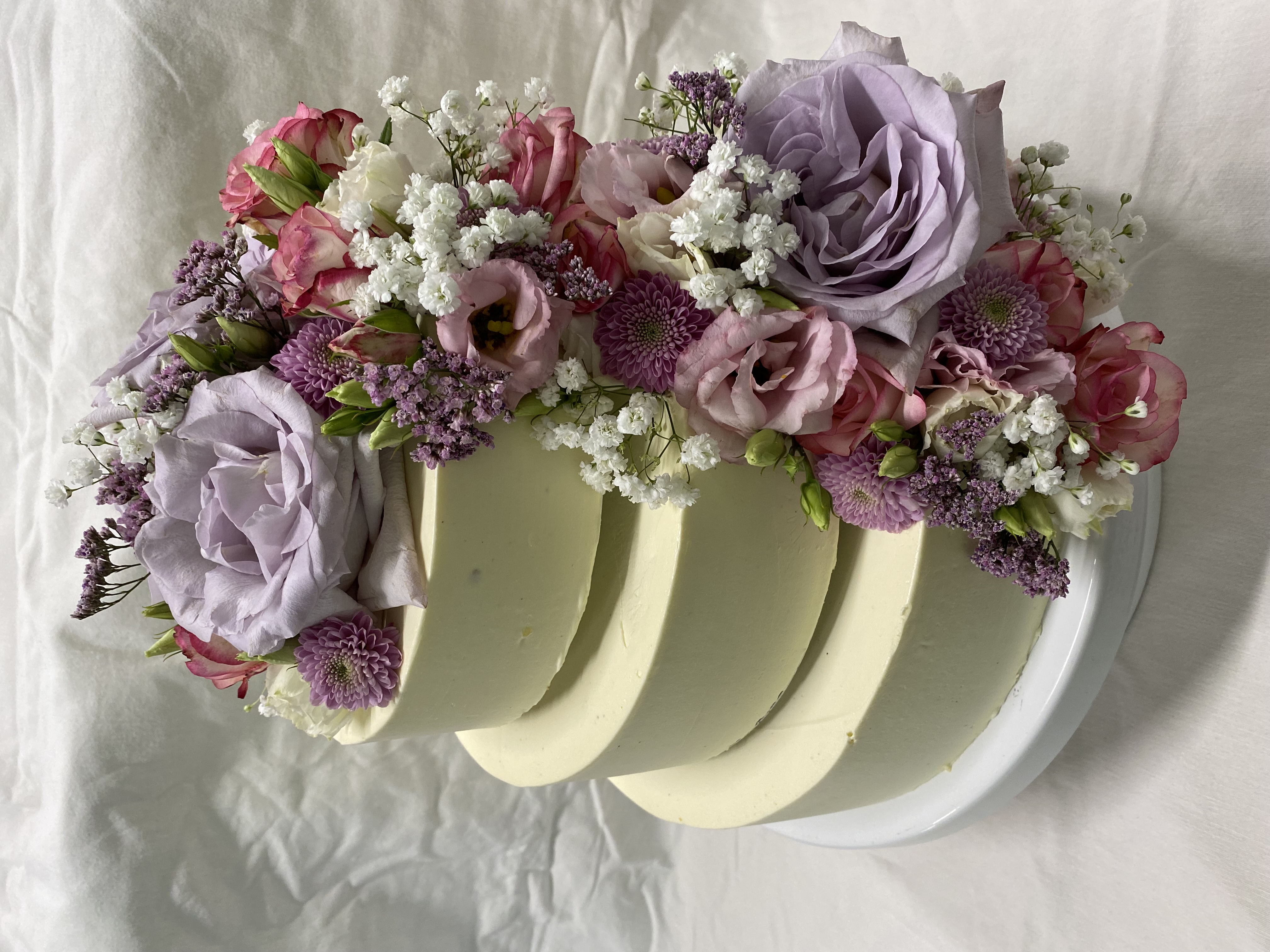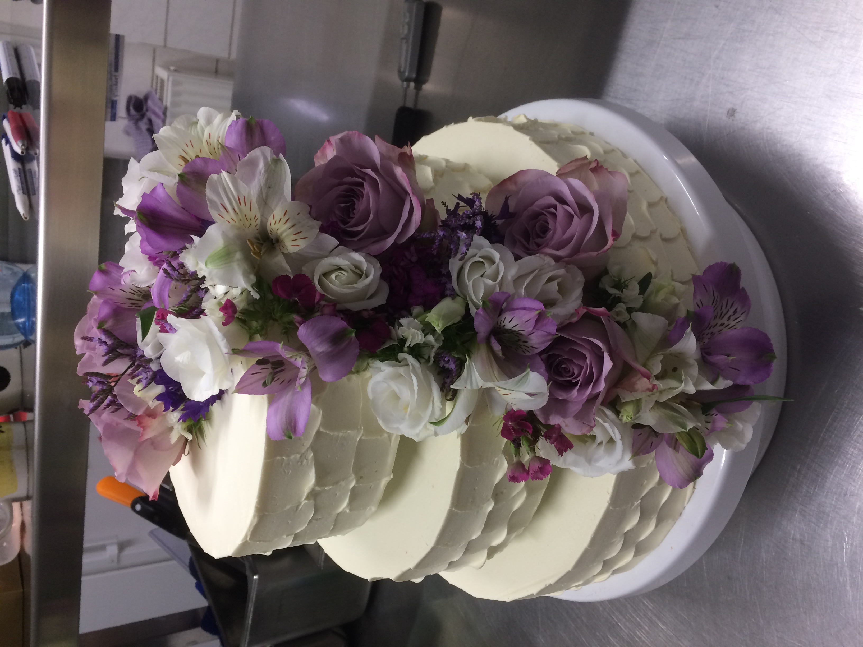 3-stöckige Torte mit 48 Portionen, glatt mit Buttercreme eingestrichen und einem üppigen Blumenbouquet in verschiedenen Lilatönen als Wasserfall.