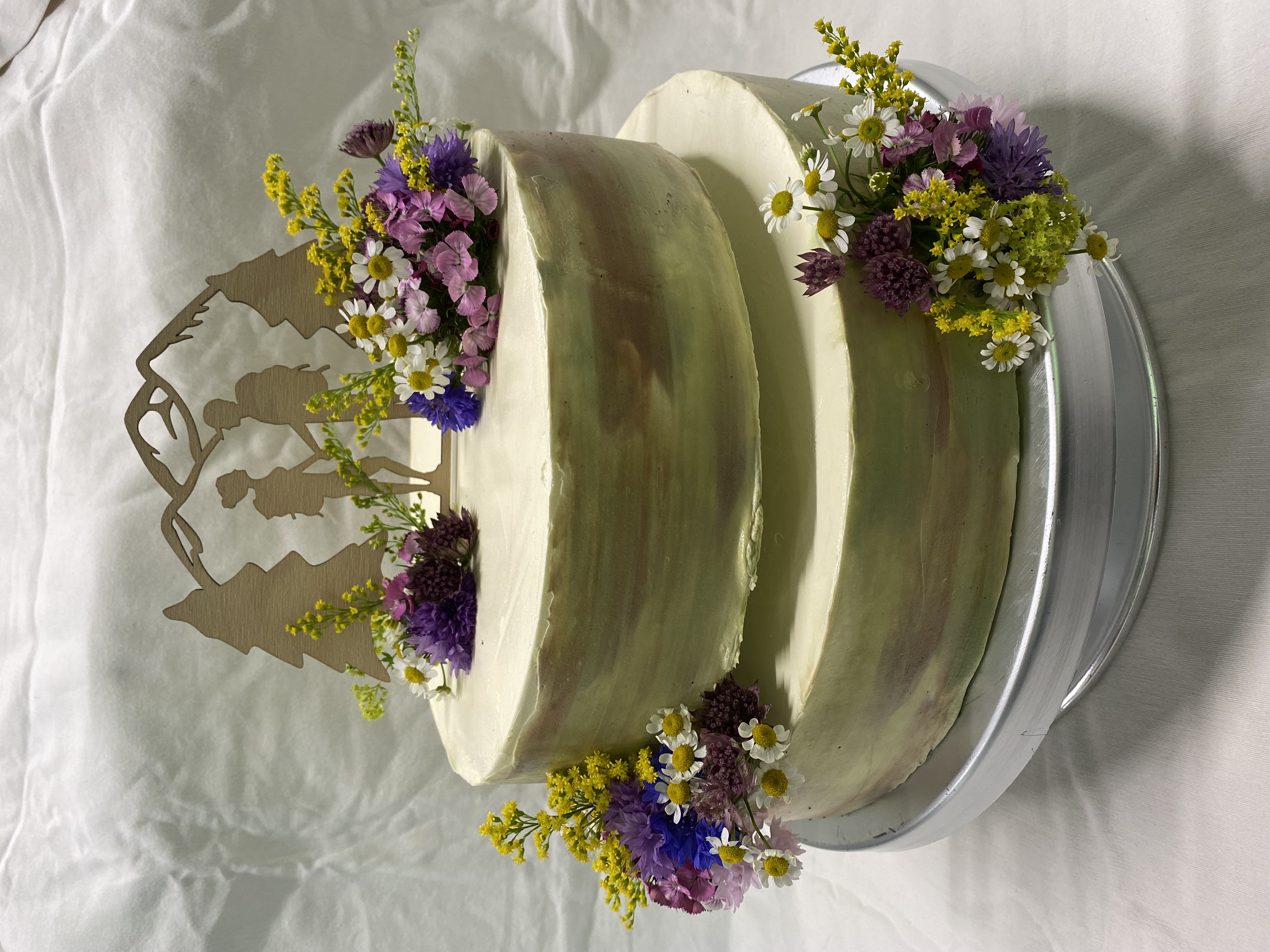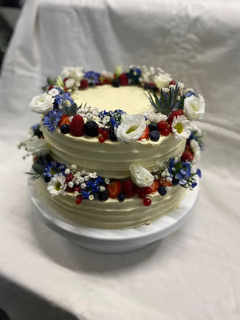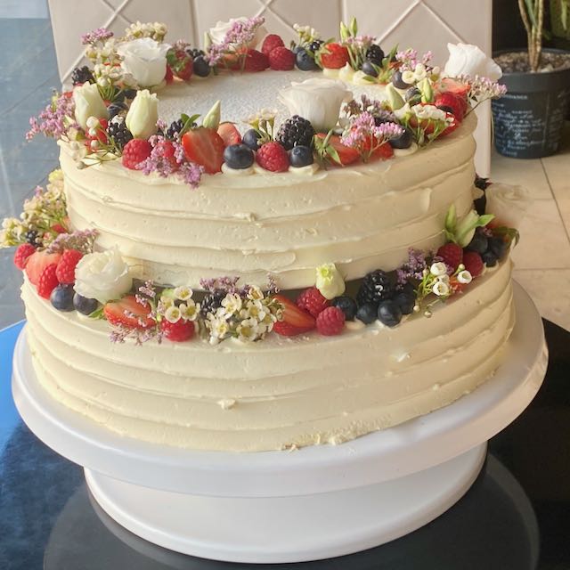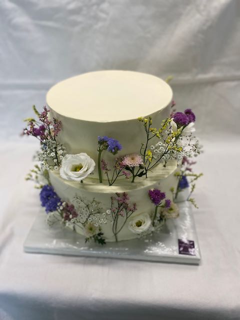Doppelt hohe, aufeinandergesetzte Torte mit angelegten Blumen und Blüten
