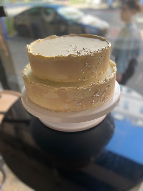 Eine Torte mit silberfarben glänzenden Blättern.