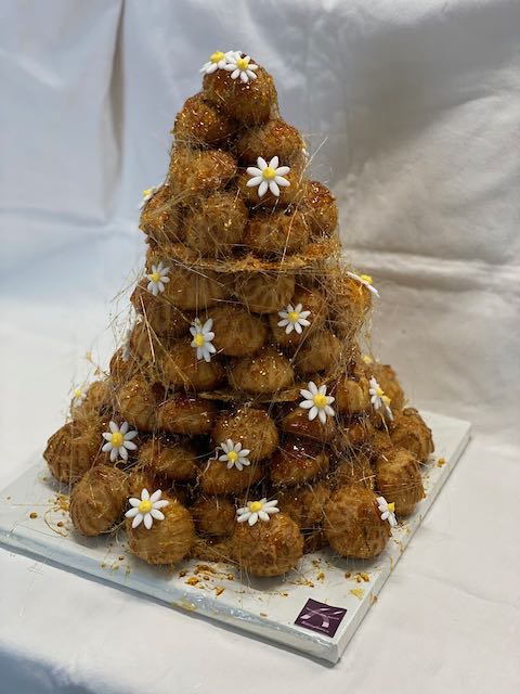 Die klassische französische Hochzeitstorte: Mini Windbeutel mit Füllung aus Vanille und Schokolade, mit Karamell zusammengesetzt.