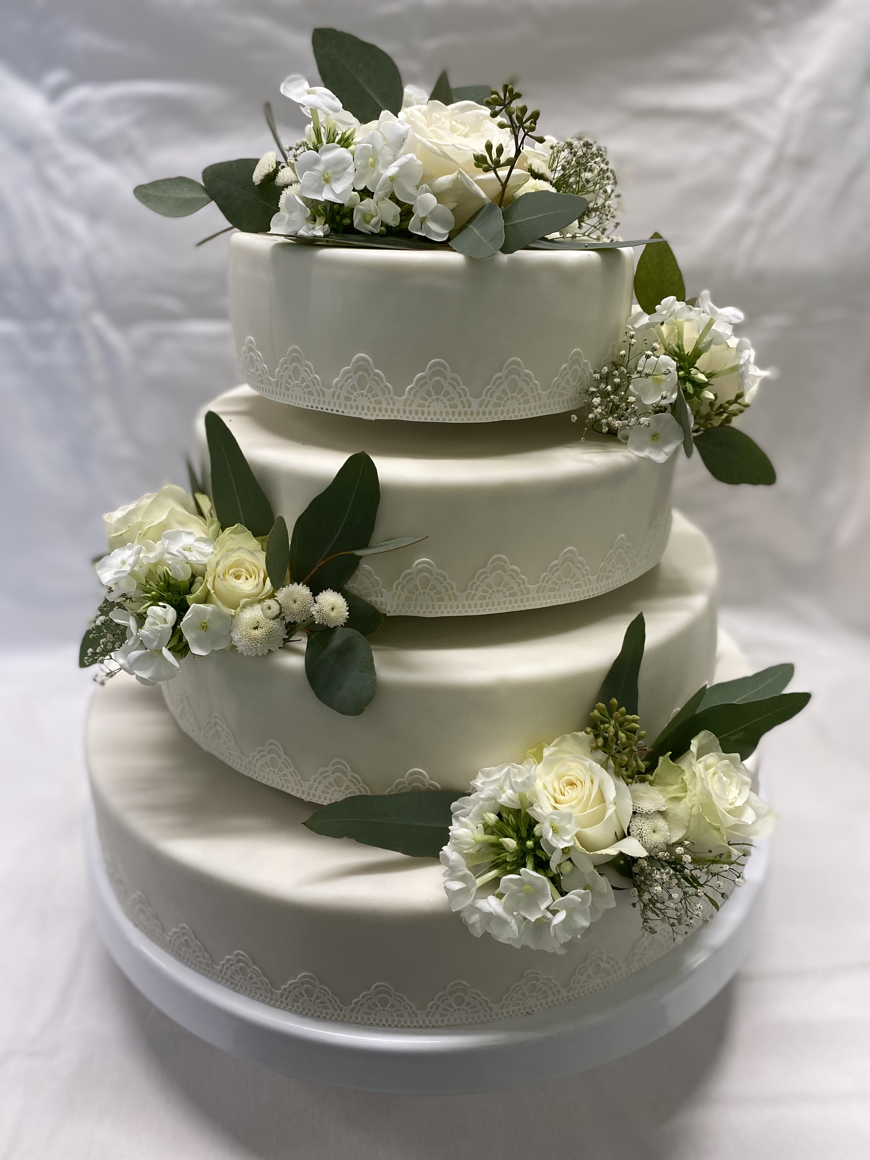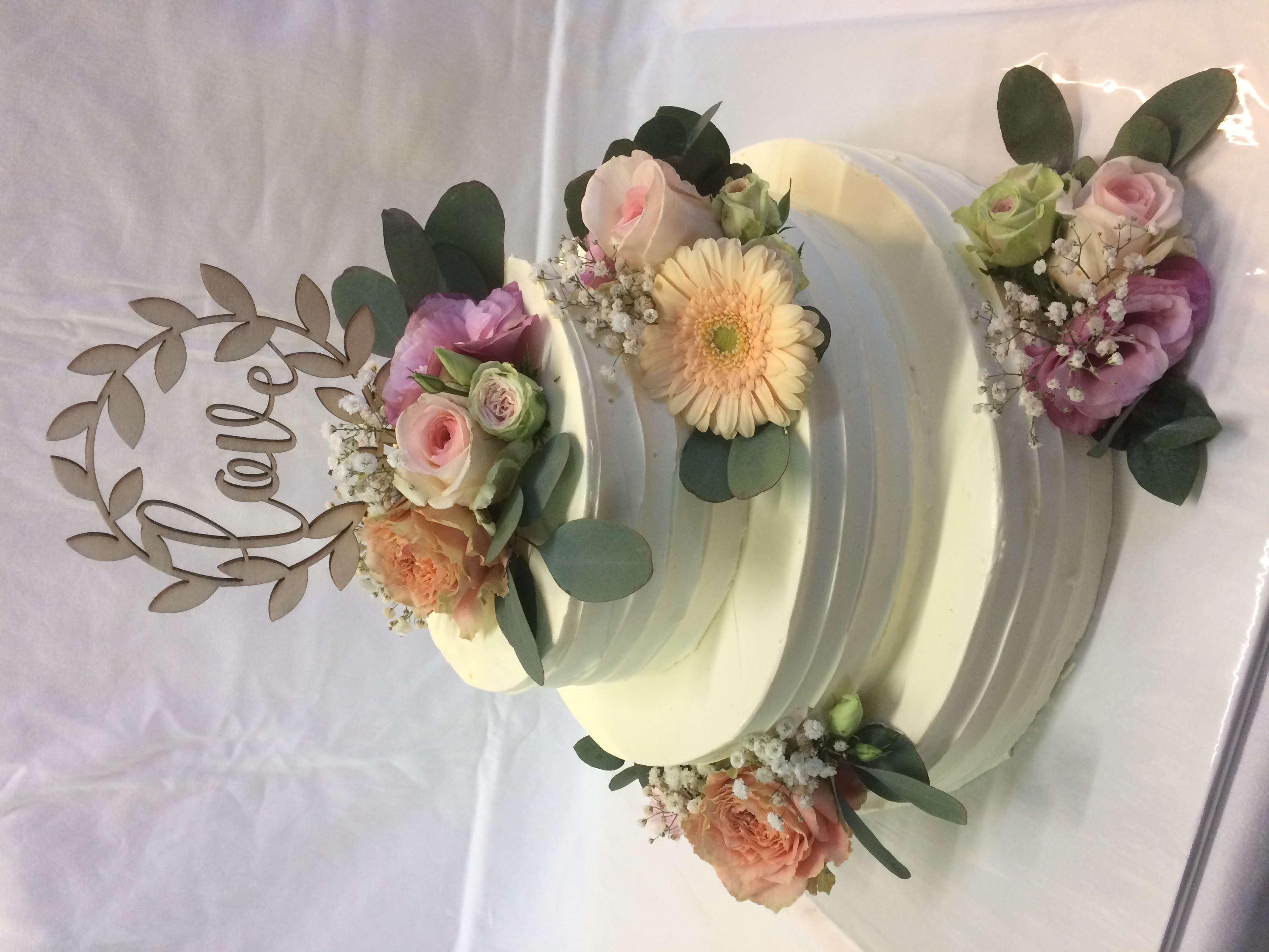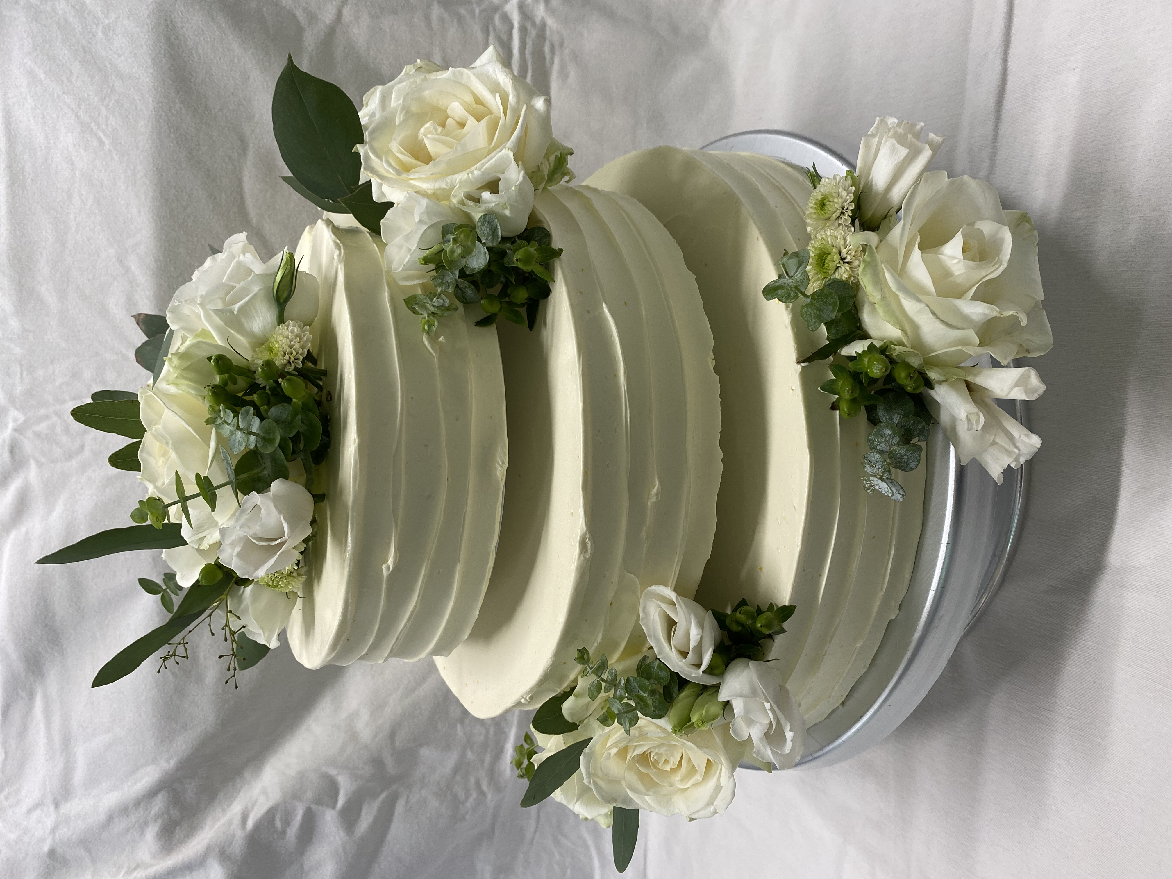 3 Stöckige Torte, mit Buttercreme in Längsrillen gespachtelt, mit Eukalyptus und Weiß als Blumenbouquets.
