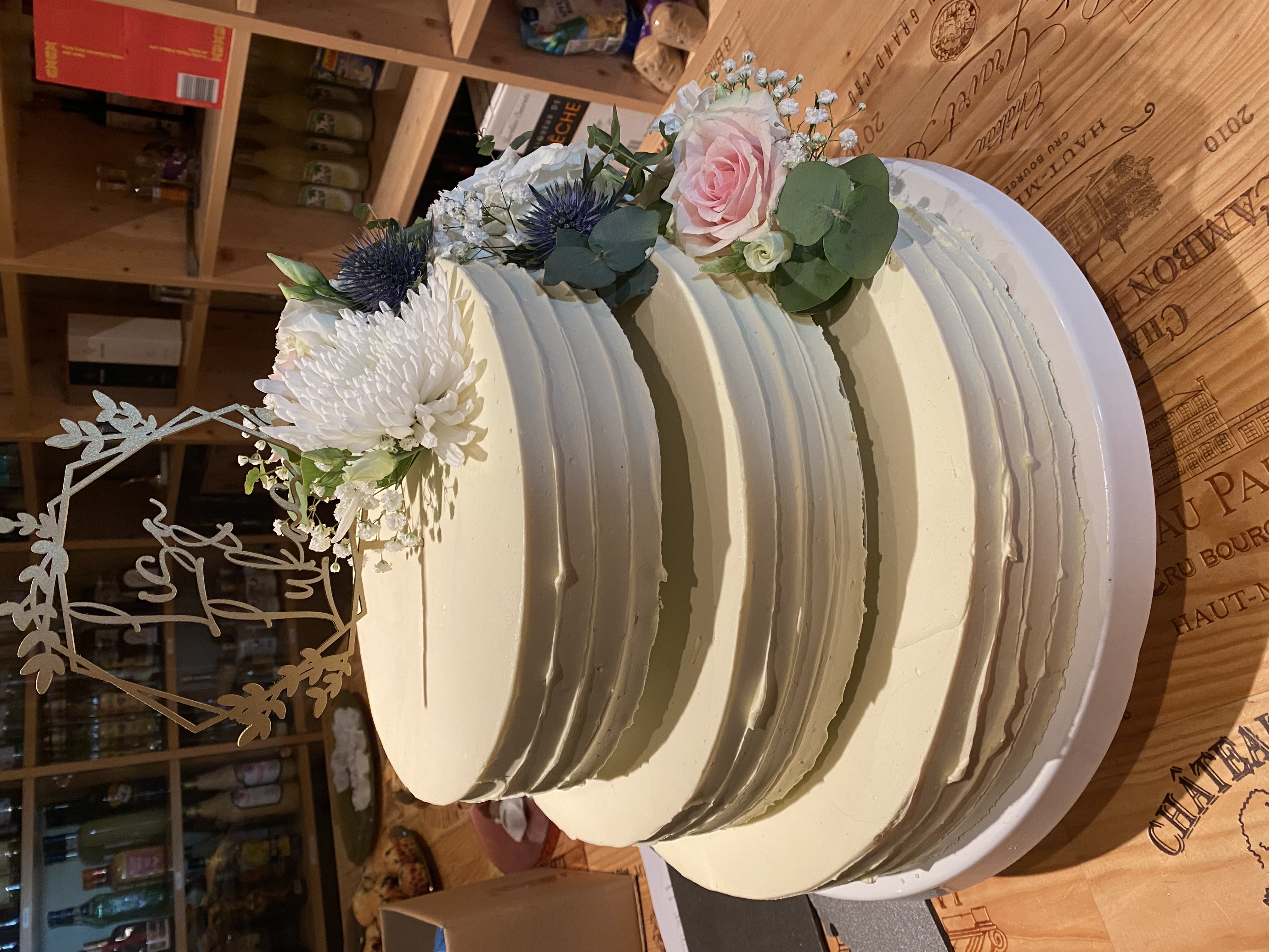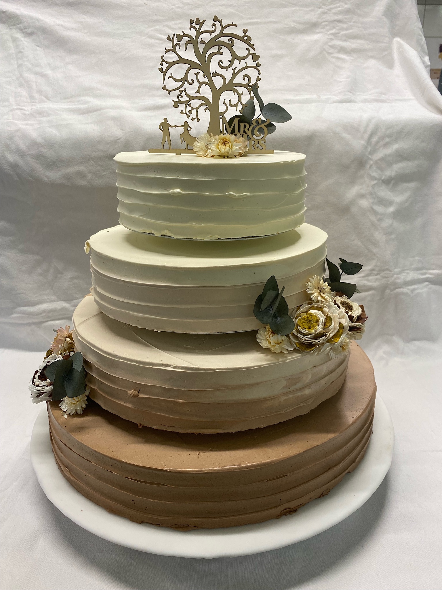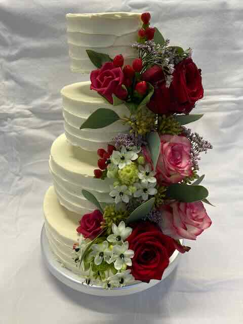 3 Stöckige Torte, mit Buttercreme in Längsrillen gespachtelt, mit Eukalyptus und Weiß als Blumenbouquets.