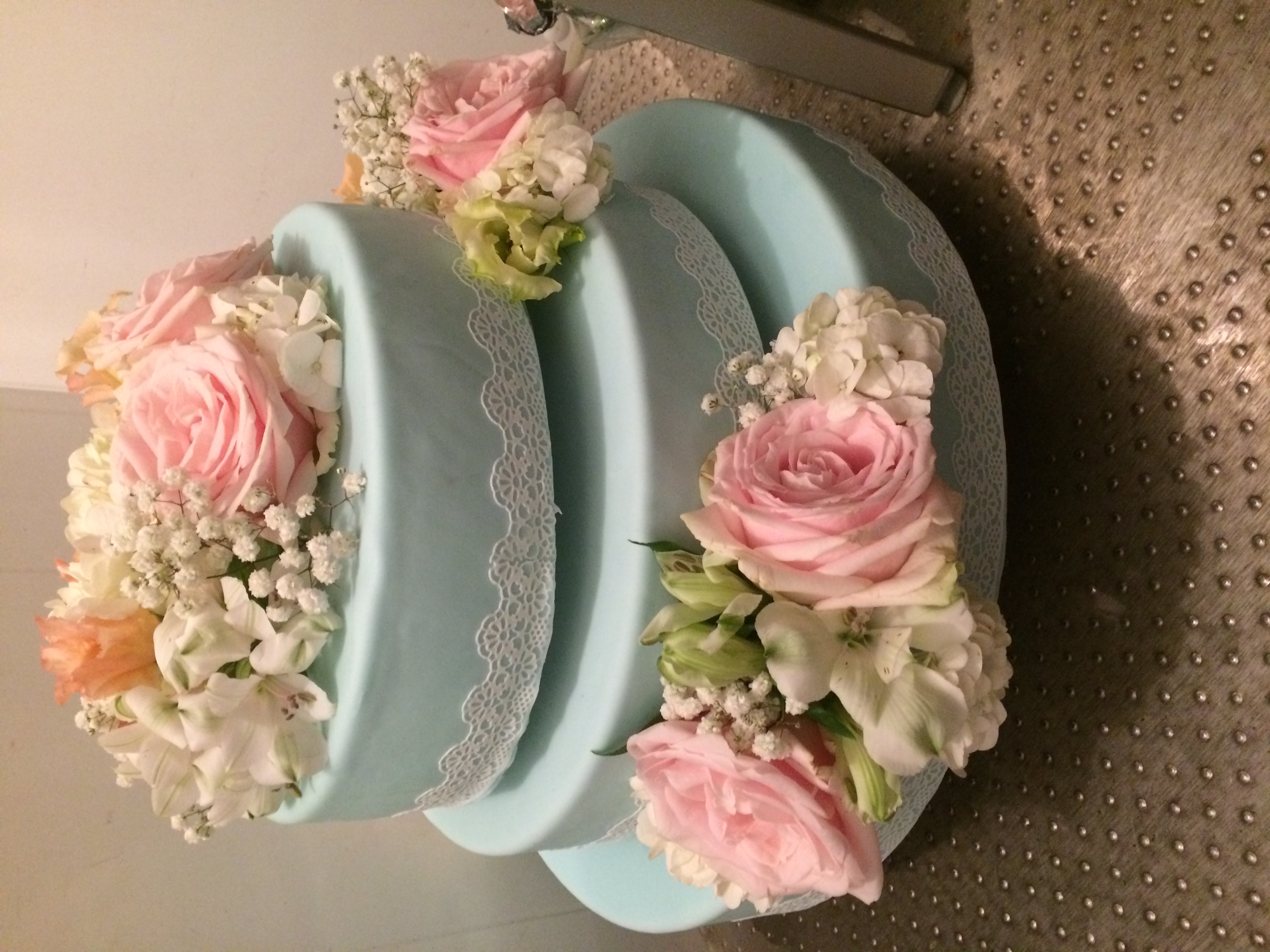 Hellblauer Fondant, Spitzenband und dezente Rosa Blüten.