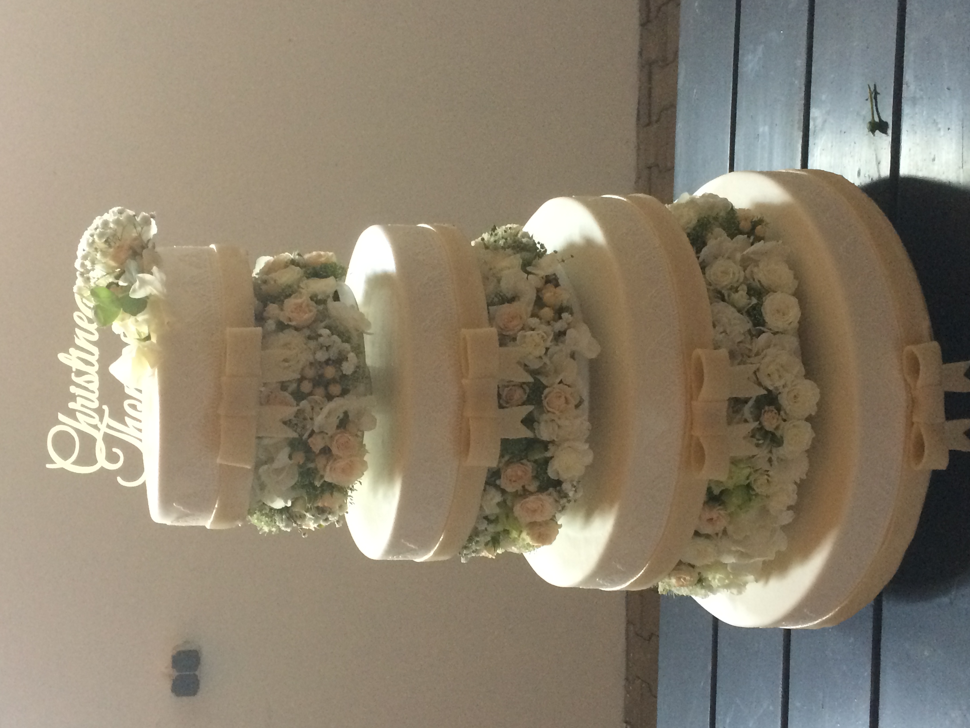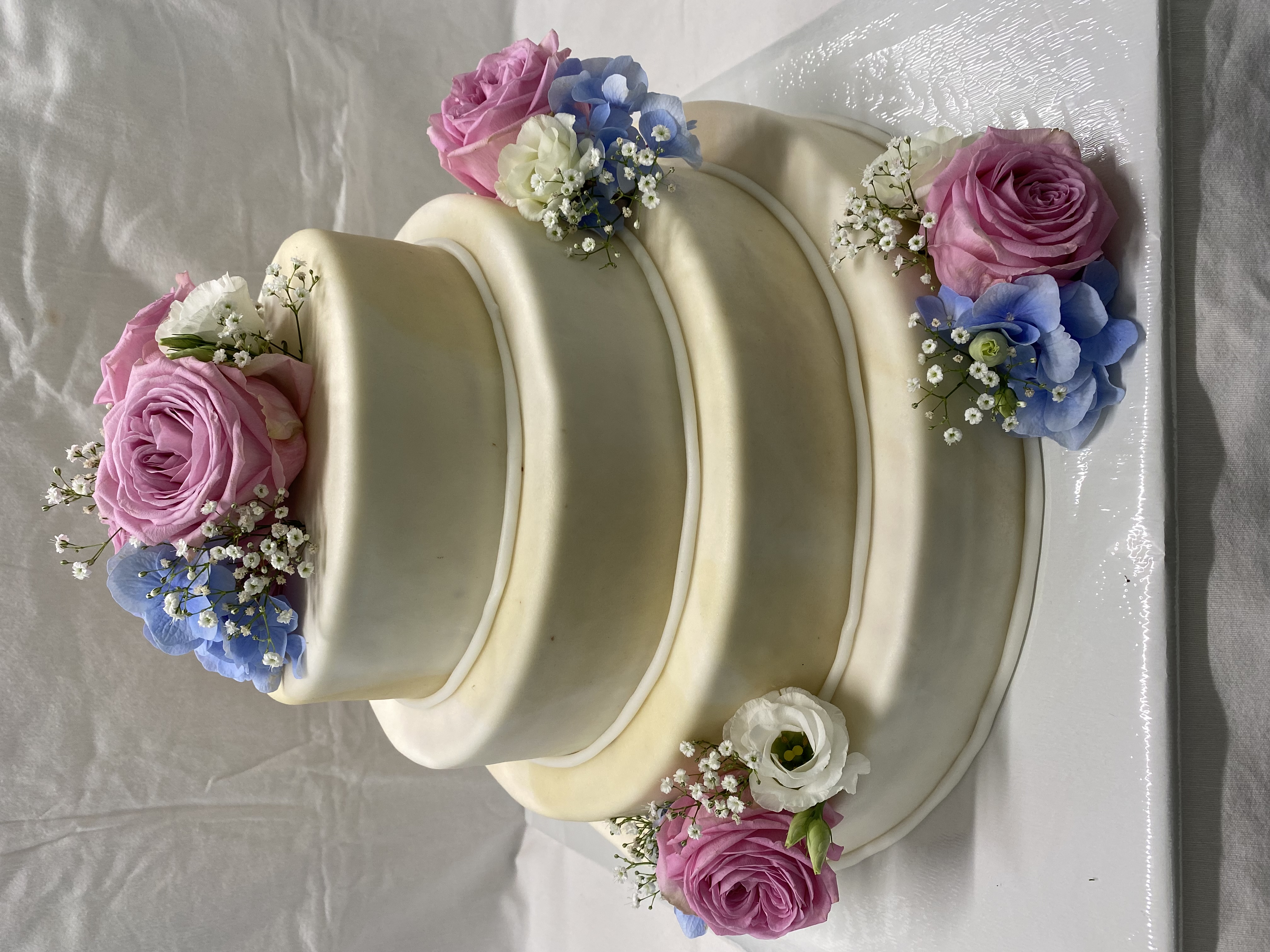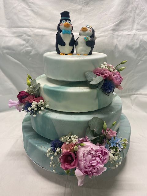 4 stöckige Torte, eingedeckt mit Fondant-Marzipan und Marmoreffekt. Dazu stilvolle Blumenbouquets in Rosa, Hellblau und Weiß.