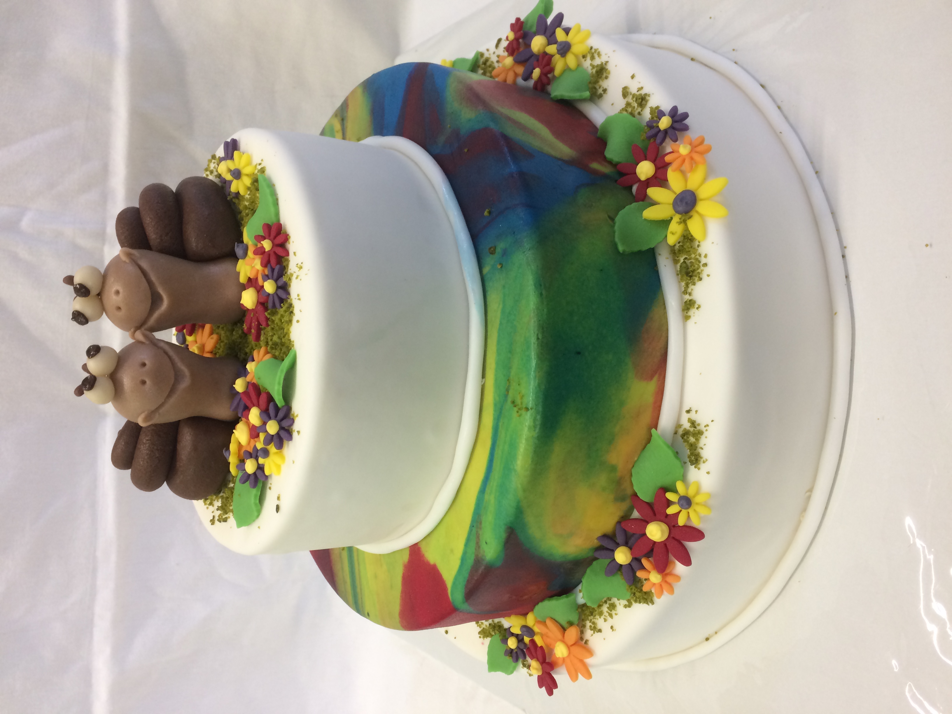 Eine Torte mit vielen bunten Blüten für die Hochzeit im Sommer.