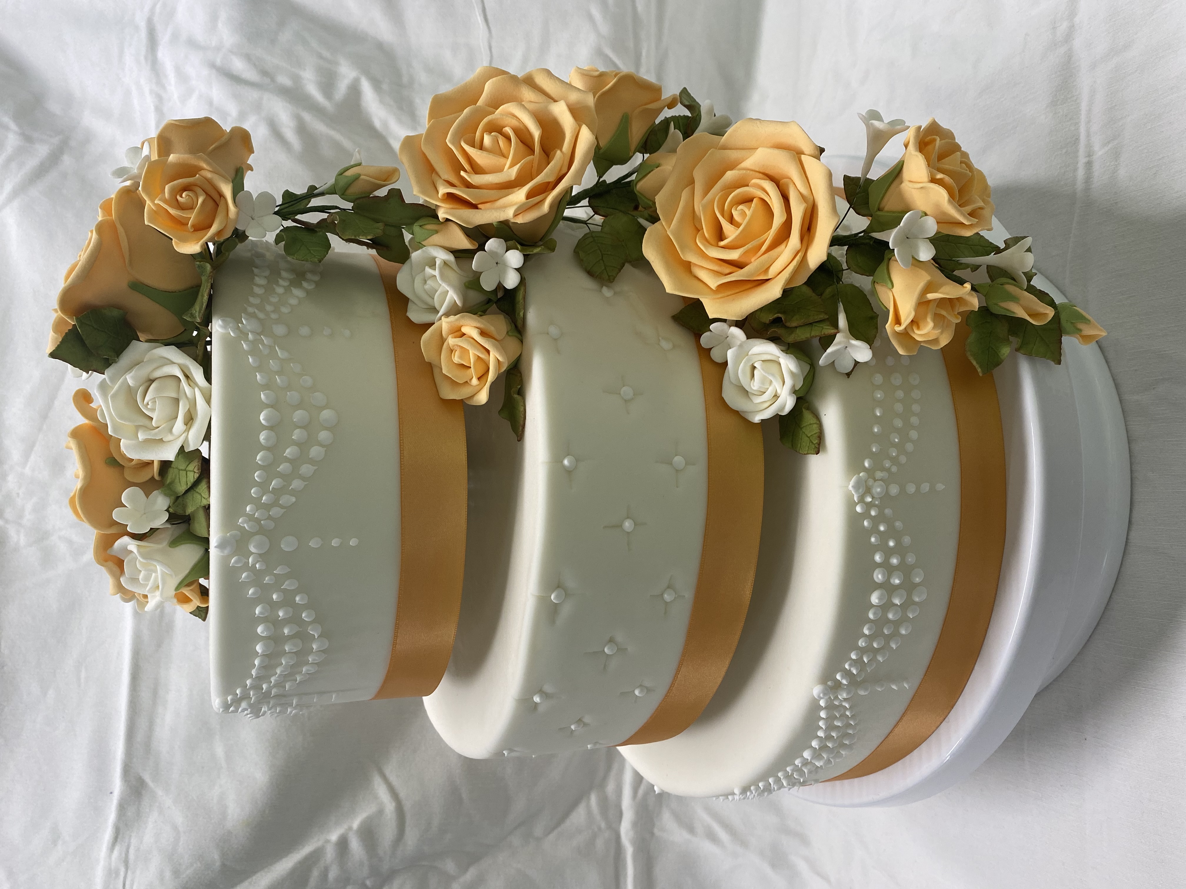 3 Stöckige Torte, 48 Stk. mit Satinband und Zuckerrosen und -blättern in Weiß und Apricot mit Applikationen aus Eiweißglasur