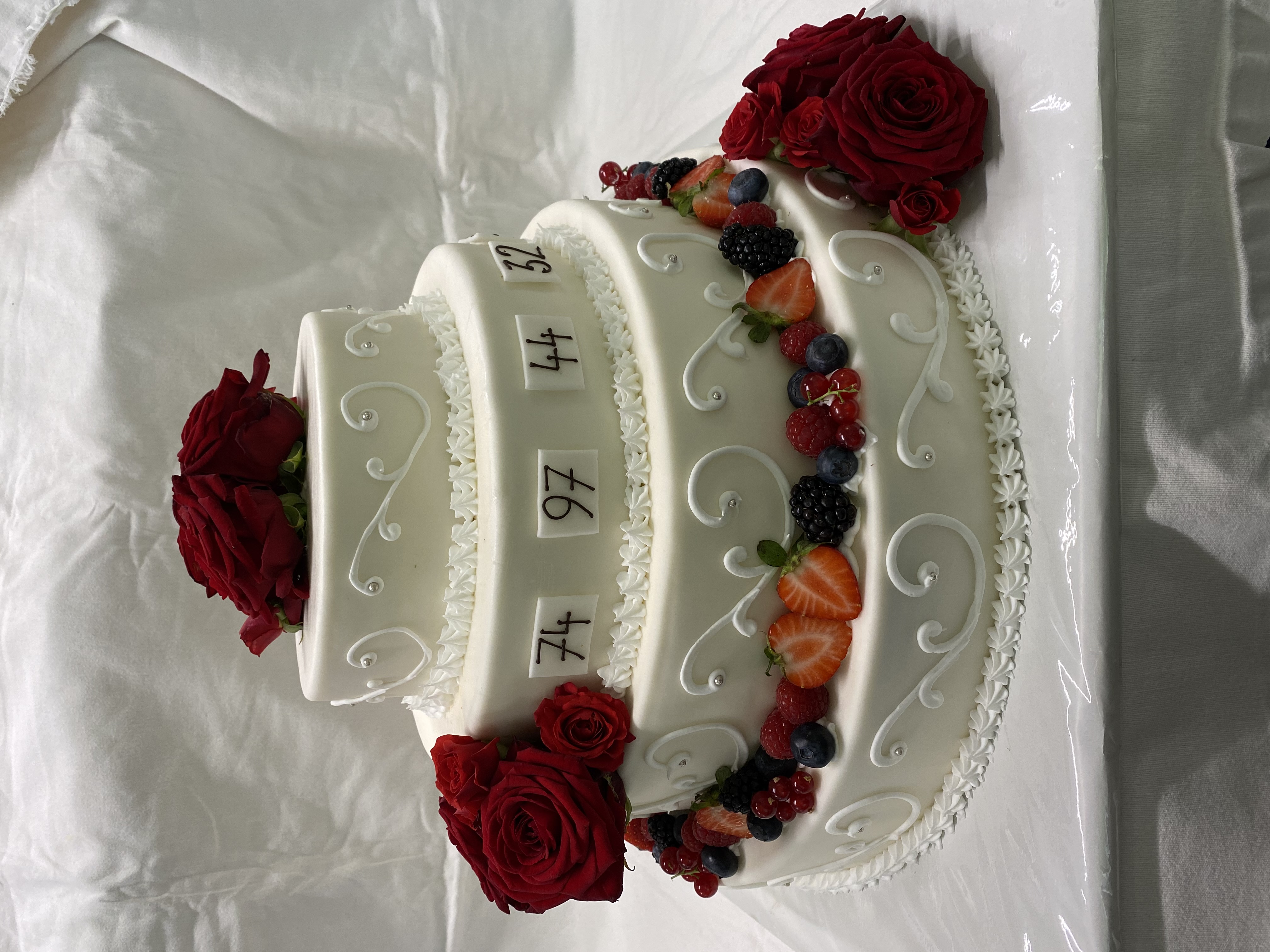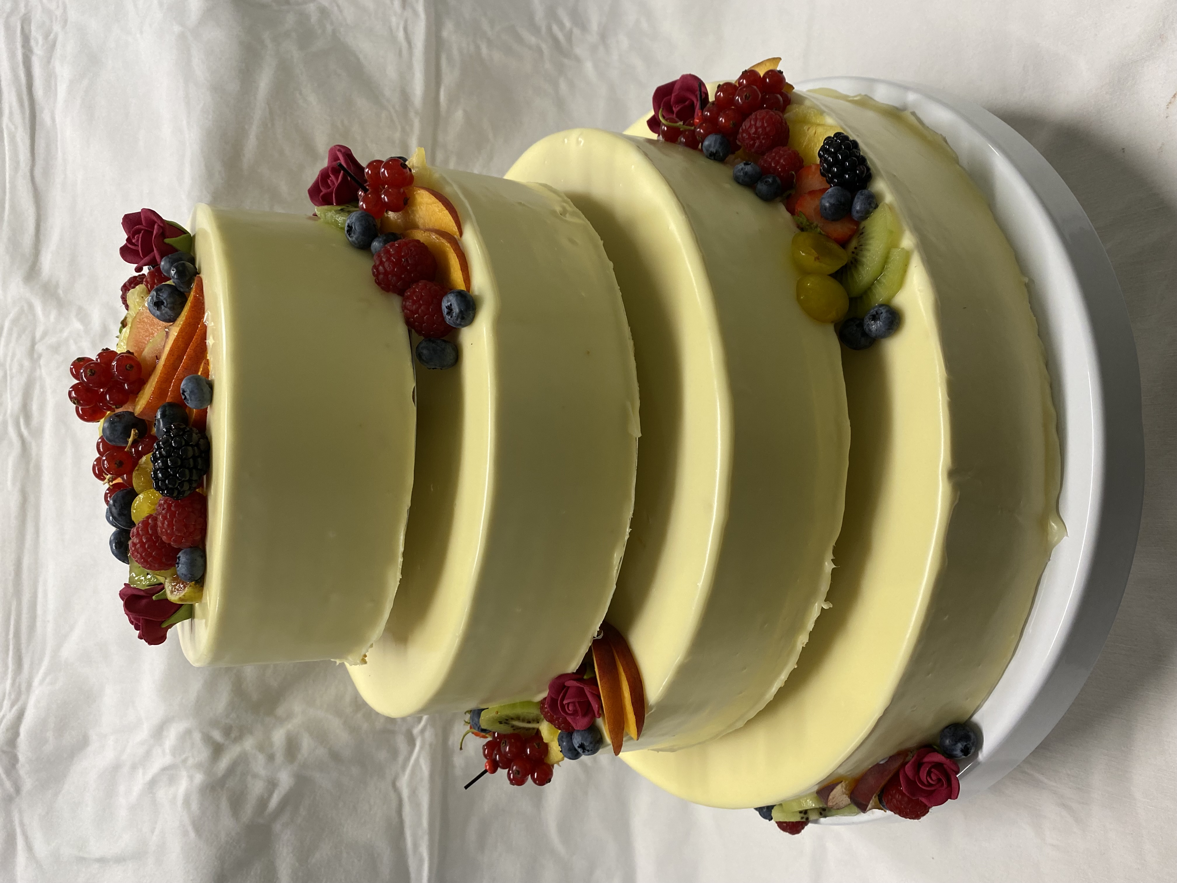 4-stöckige Torte, alle Mandarinencreme, mit weißem Ganache überzogen, Beeren und roten Zuckerröschen