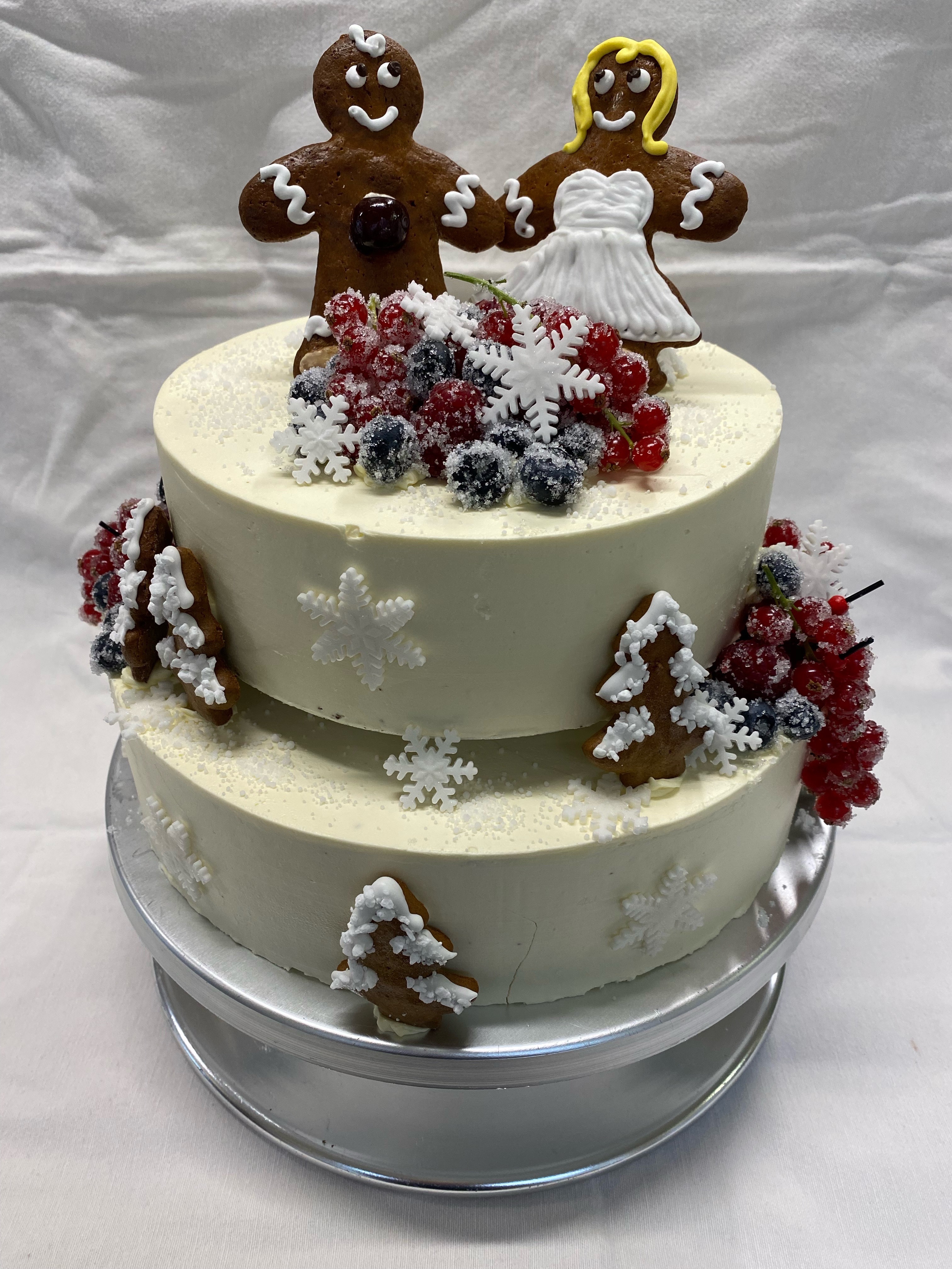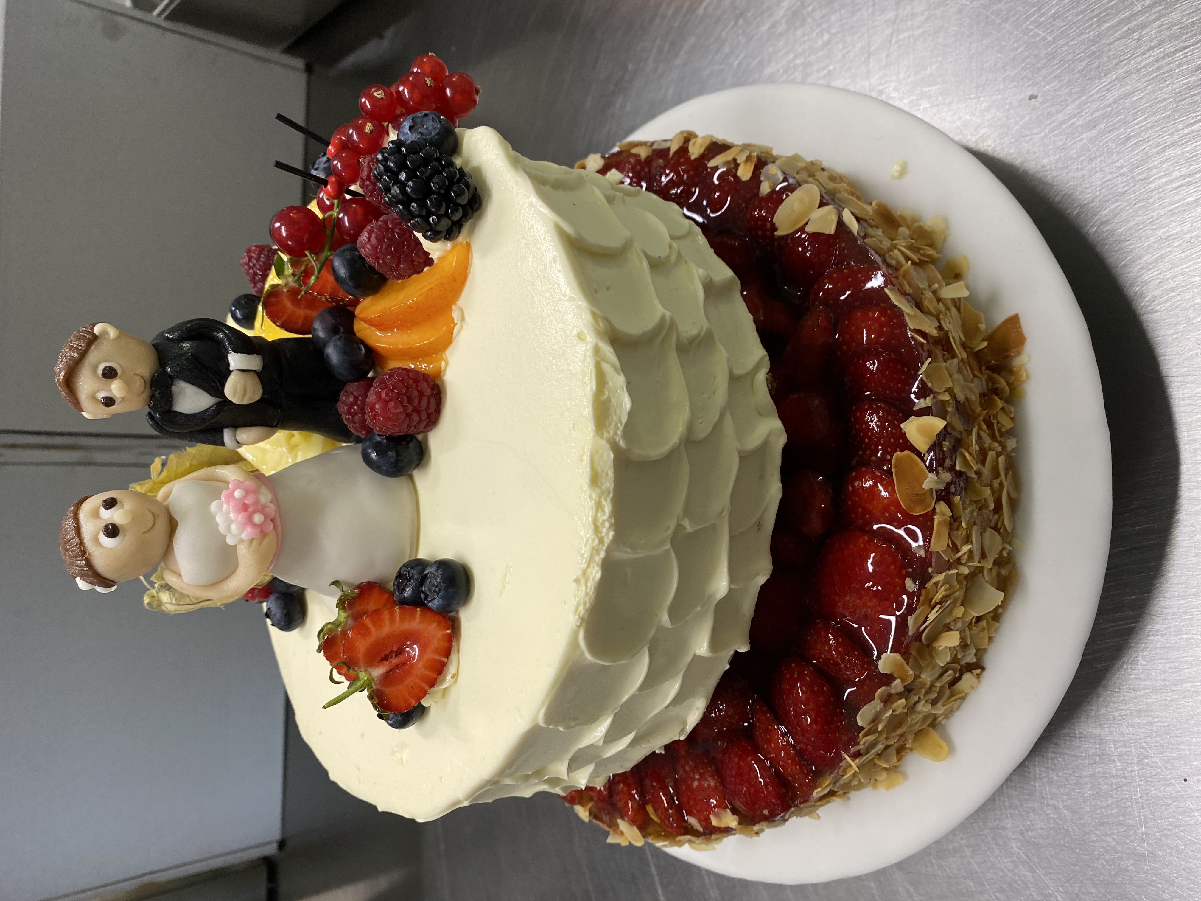2-stöckige Torte, unten Erdbeerkuchen und oben Torte mit Schuppenmuster gespachtelt, dazu ein von uns modelliertes Brautpaar und einem kleinen Beerenbouquet.