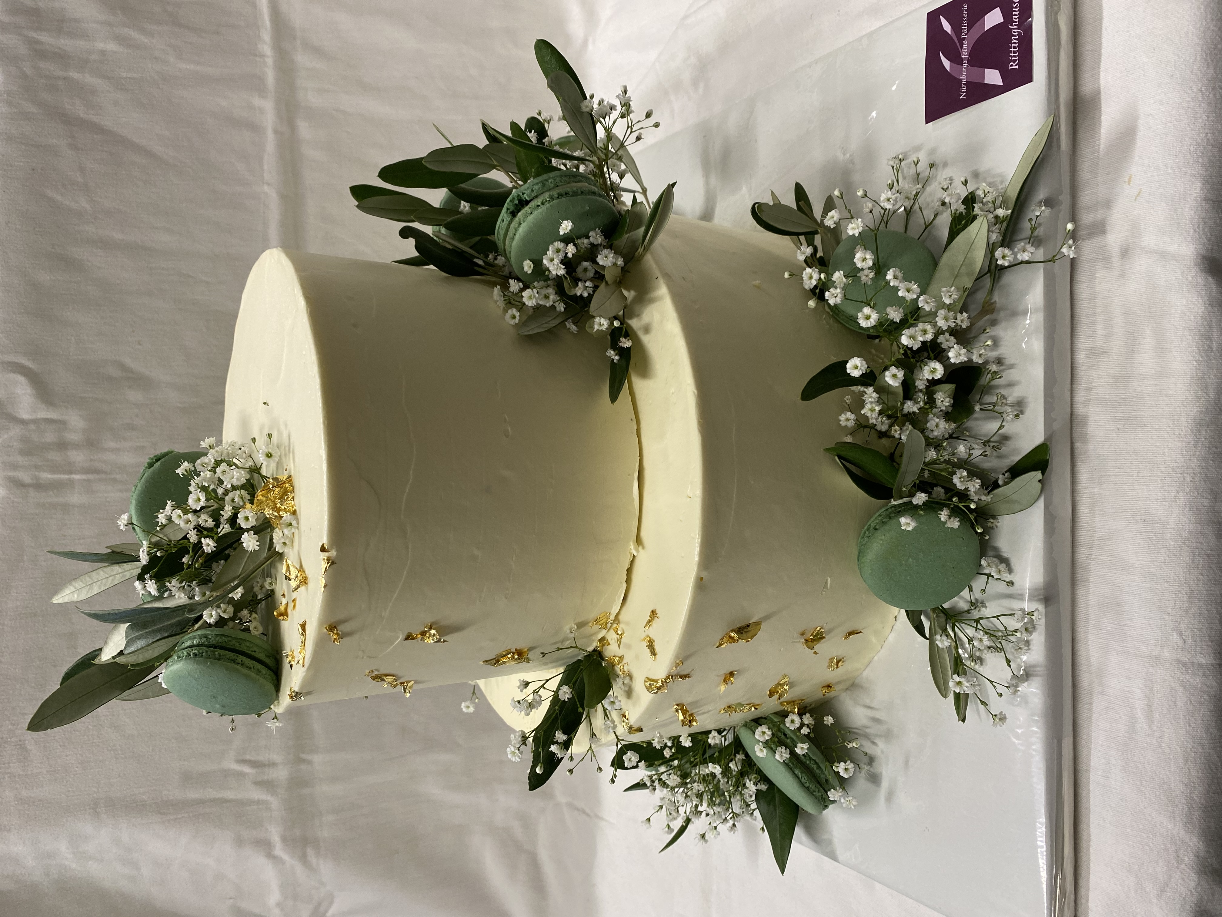 2 doppelt hohe Torten, aufeinandergesetzt, 48 Portionen, glatt gespachtelt mit Eucalytus, Vanillemacarons in der passenden Farbe und Blattgold