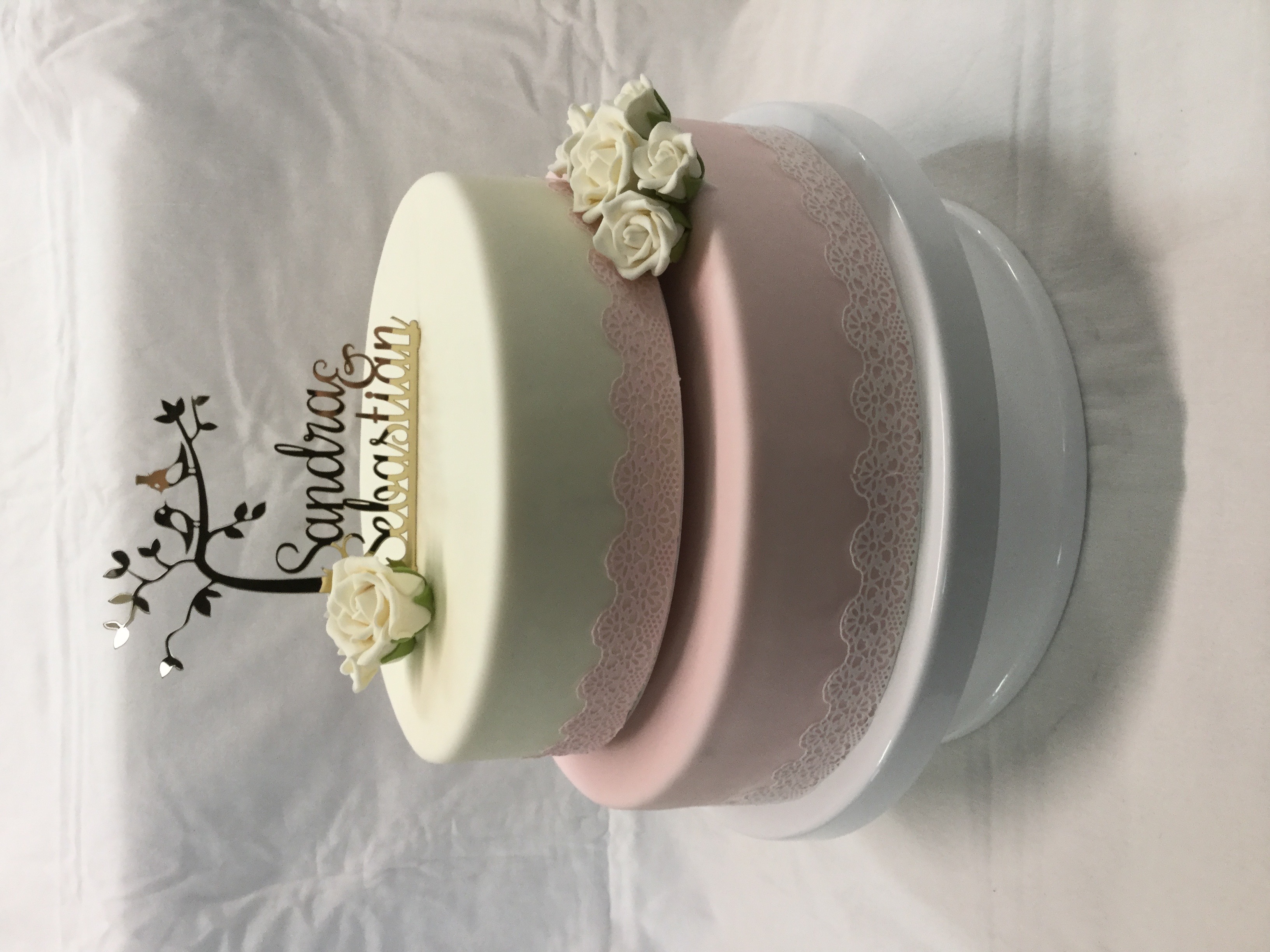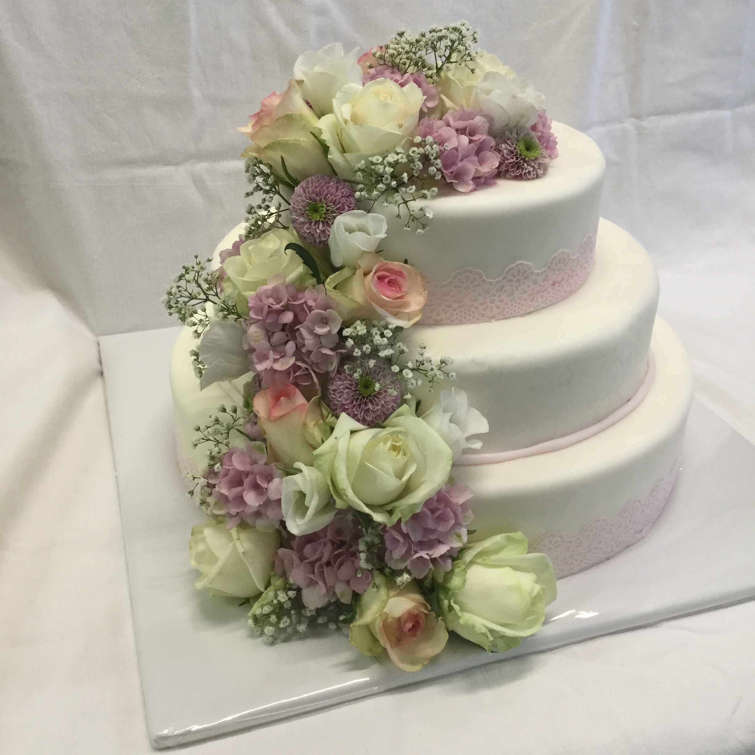 3-stöckige Torte aufeinander, oben und unten mit Spitzenband und einem Blumenwasserfall in Rosa und Weiß