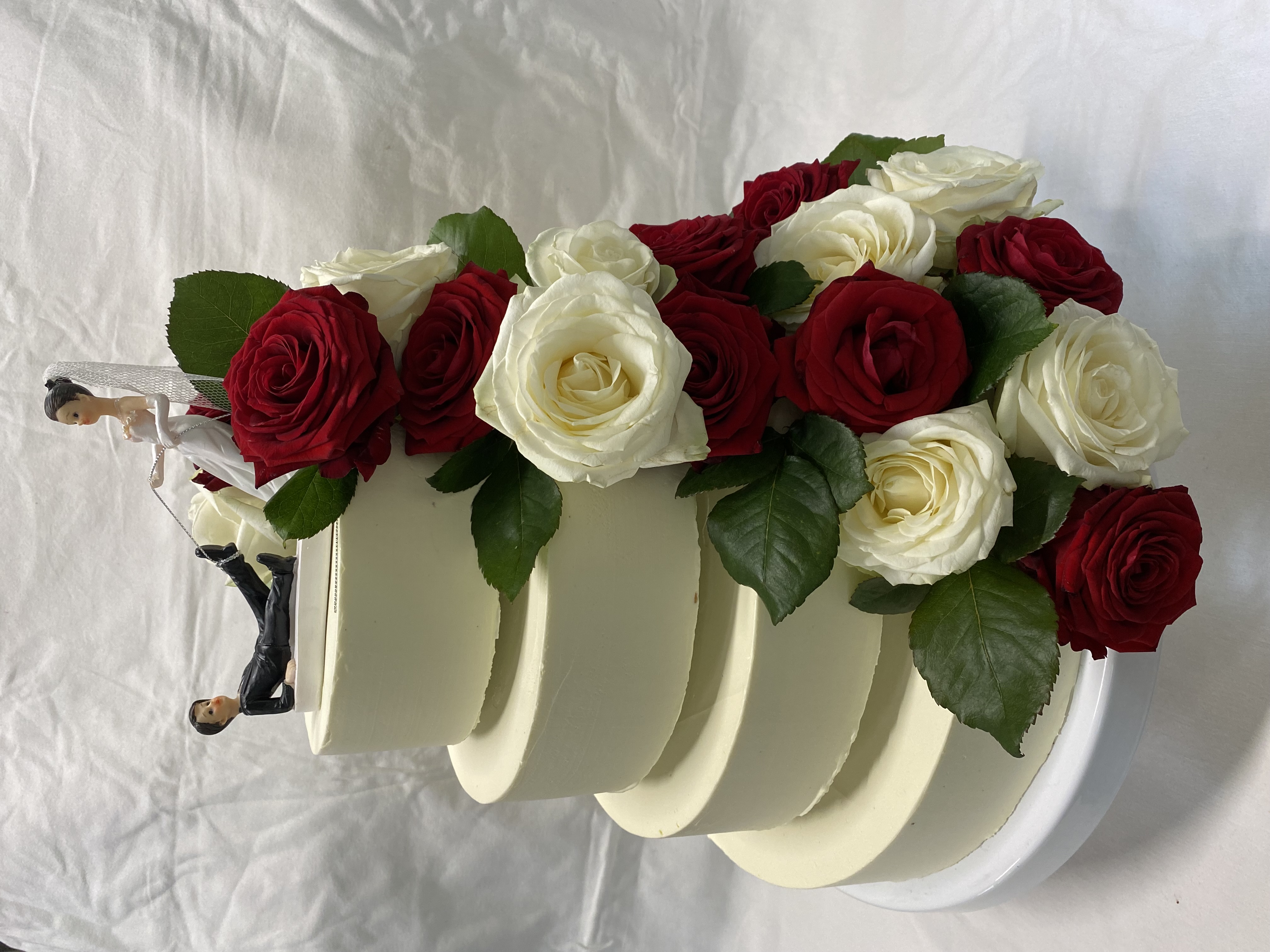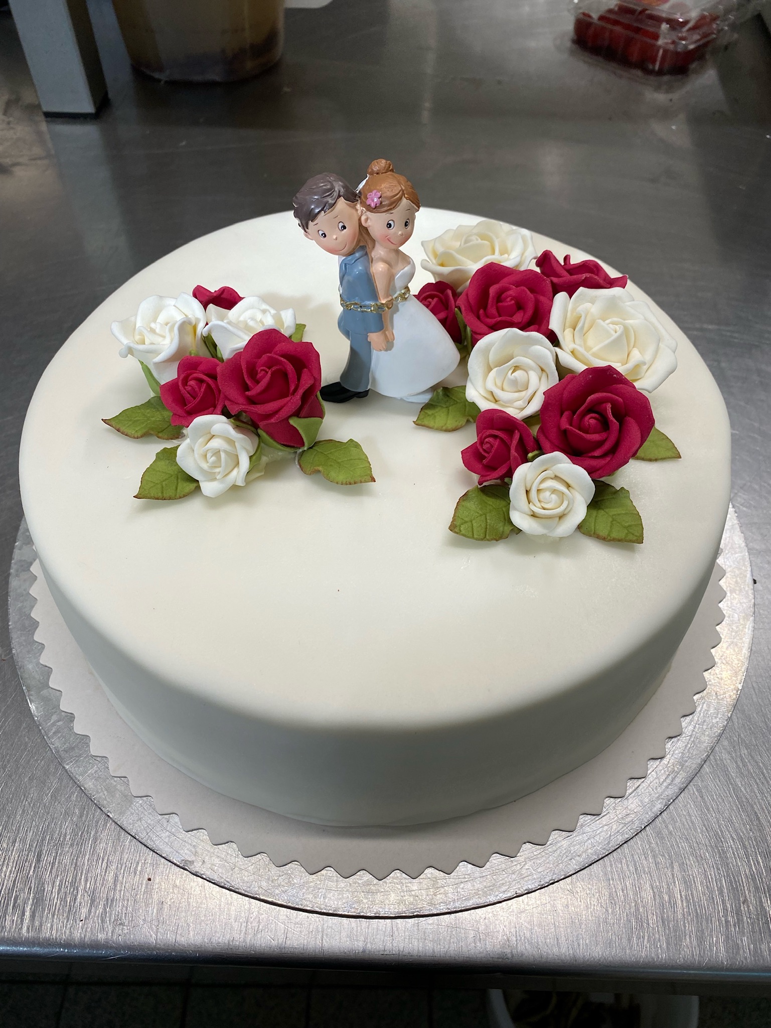 Torte, 16 Stk, mit Fondant eingedeckt, weißen und roten Zuckerrosen und Brautpaar.