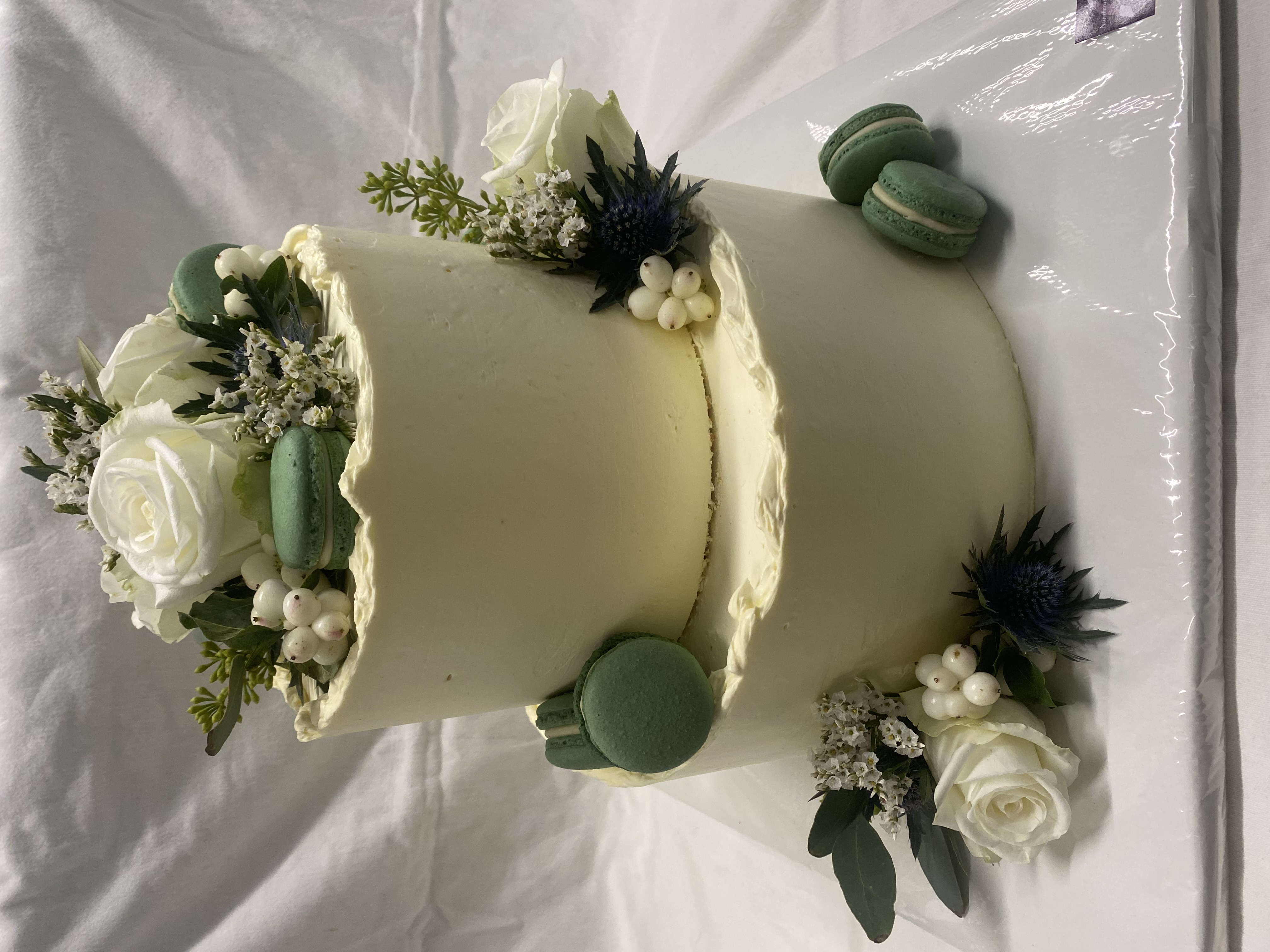 Moderne Hochzeitstorte, 2-stöckig, doppelt hoch, 48 Stk., in Eucalyptus, Distelblüten, und weißen Rosen, ergänzt mit Macarons.