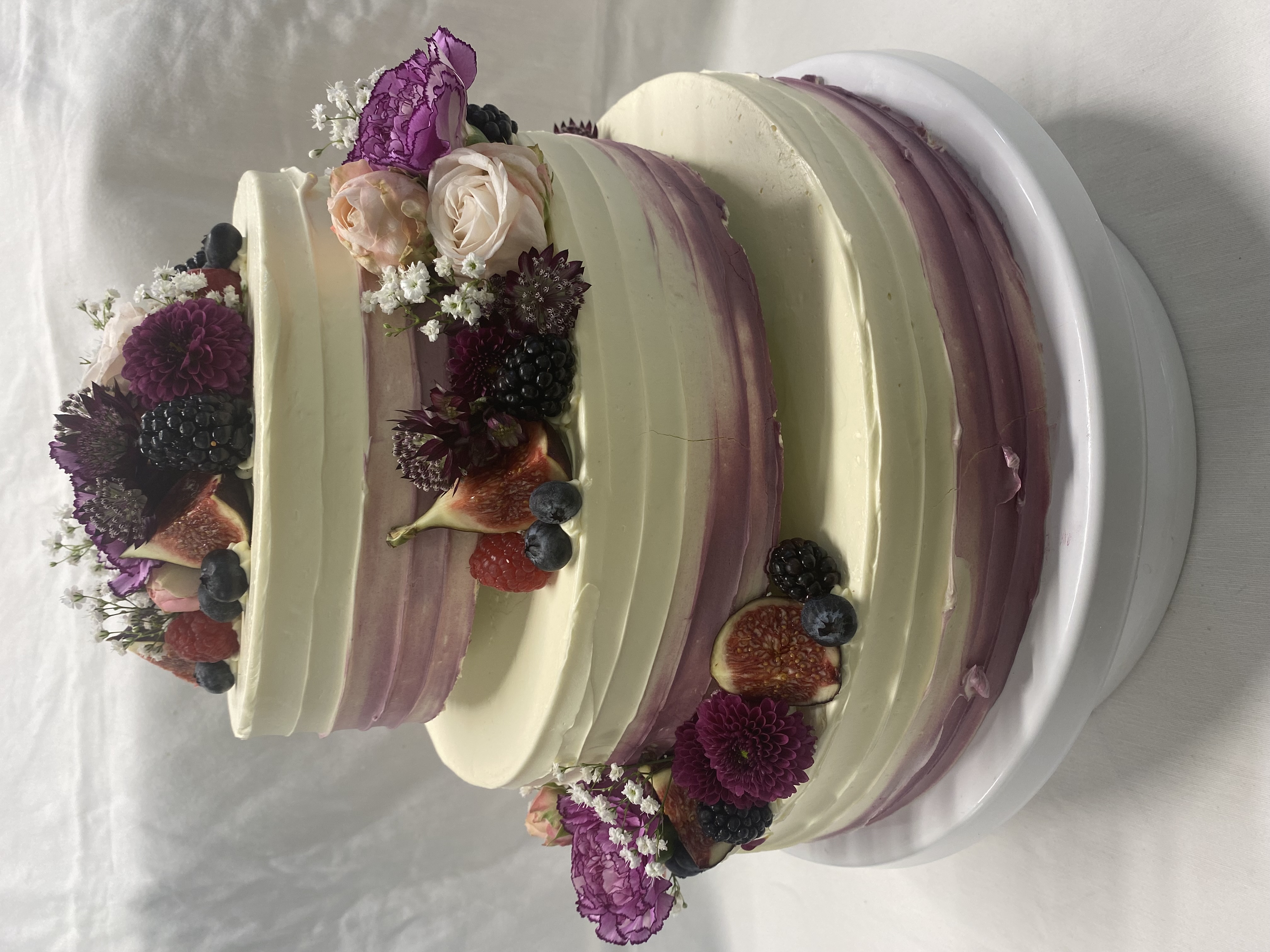 3-stöckige Torte, 48 Stk., in Weiß mit Lilatönen, passendem Blumenschmuck, Feigen und Beeren.
