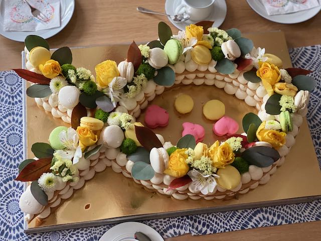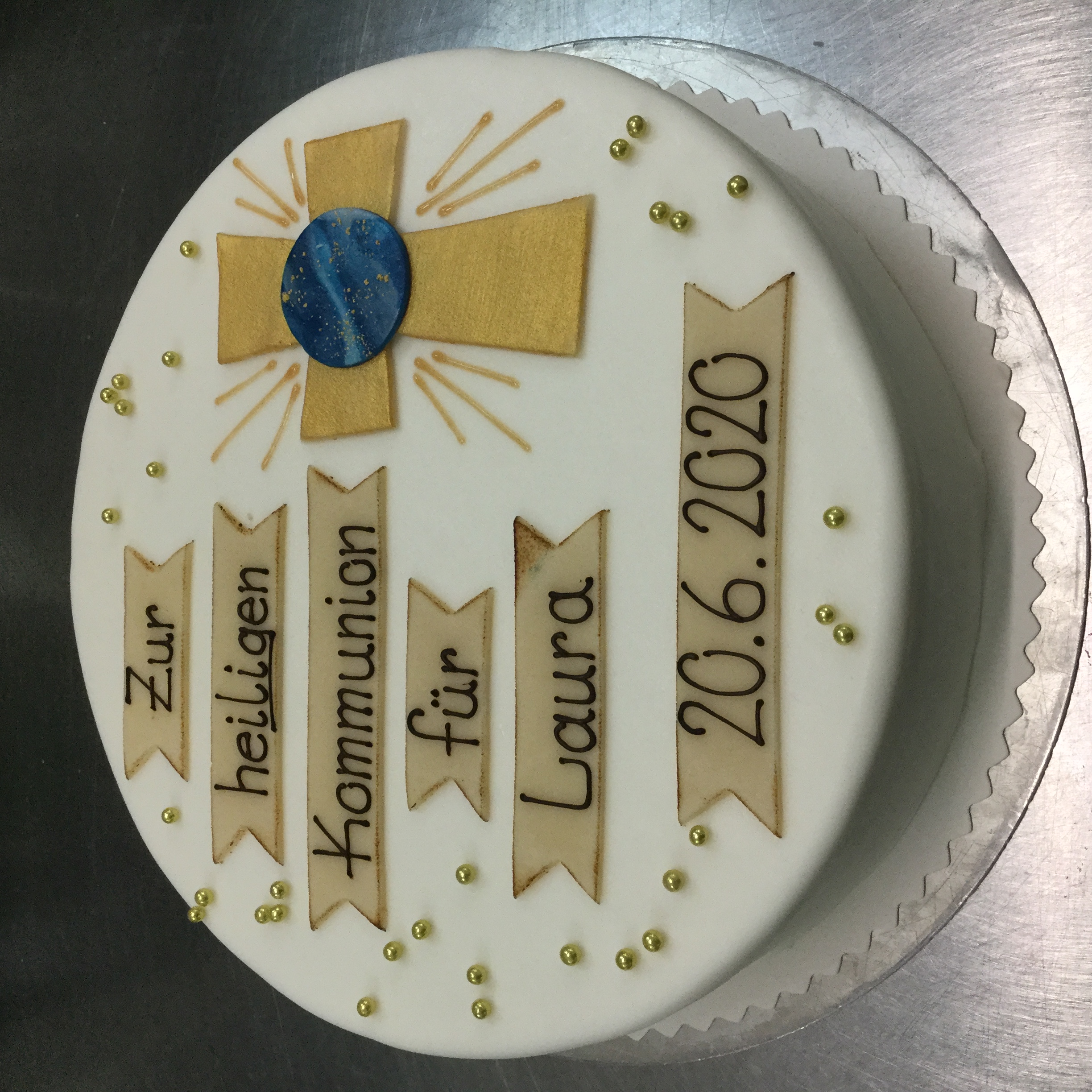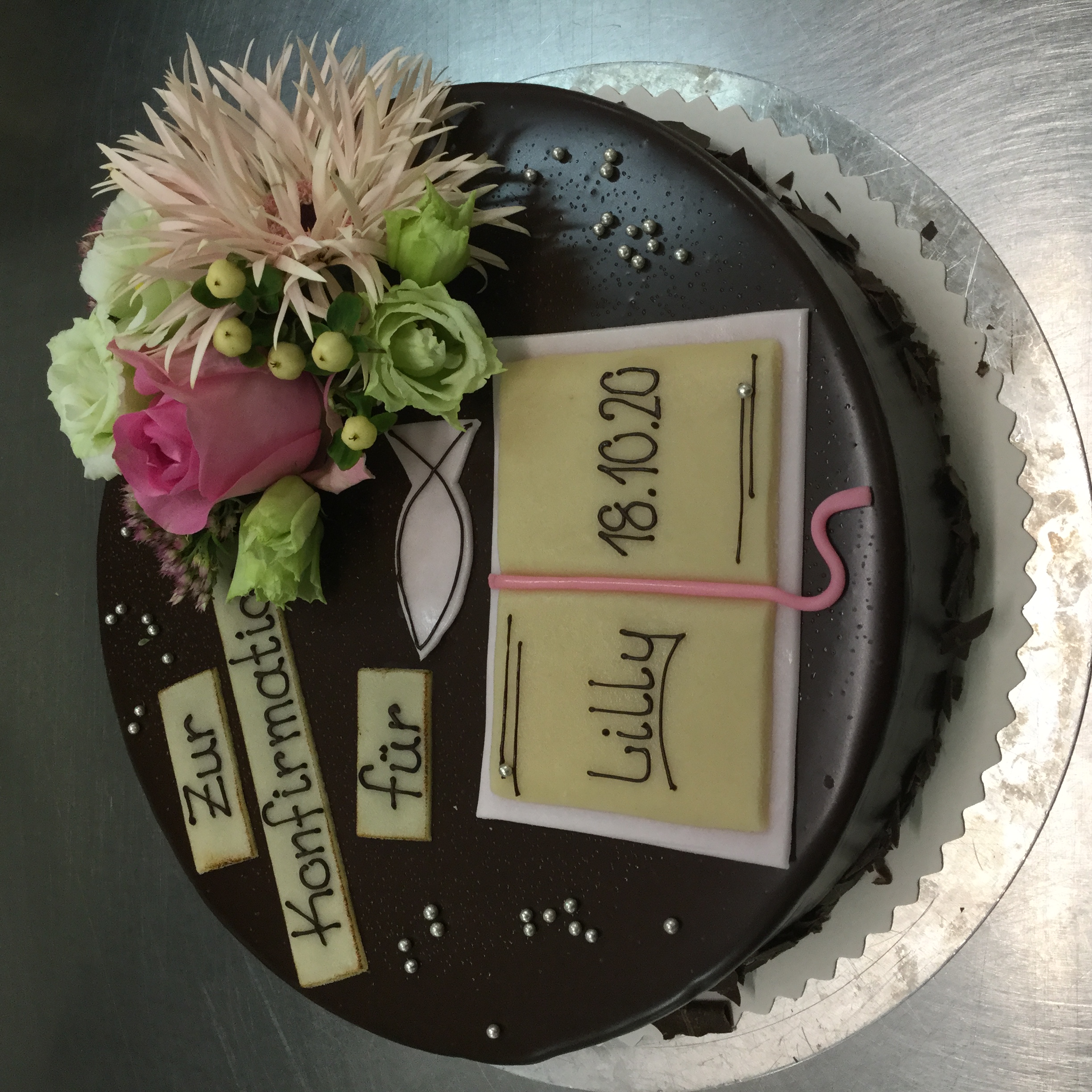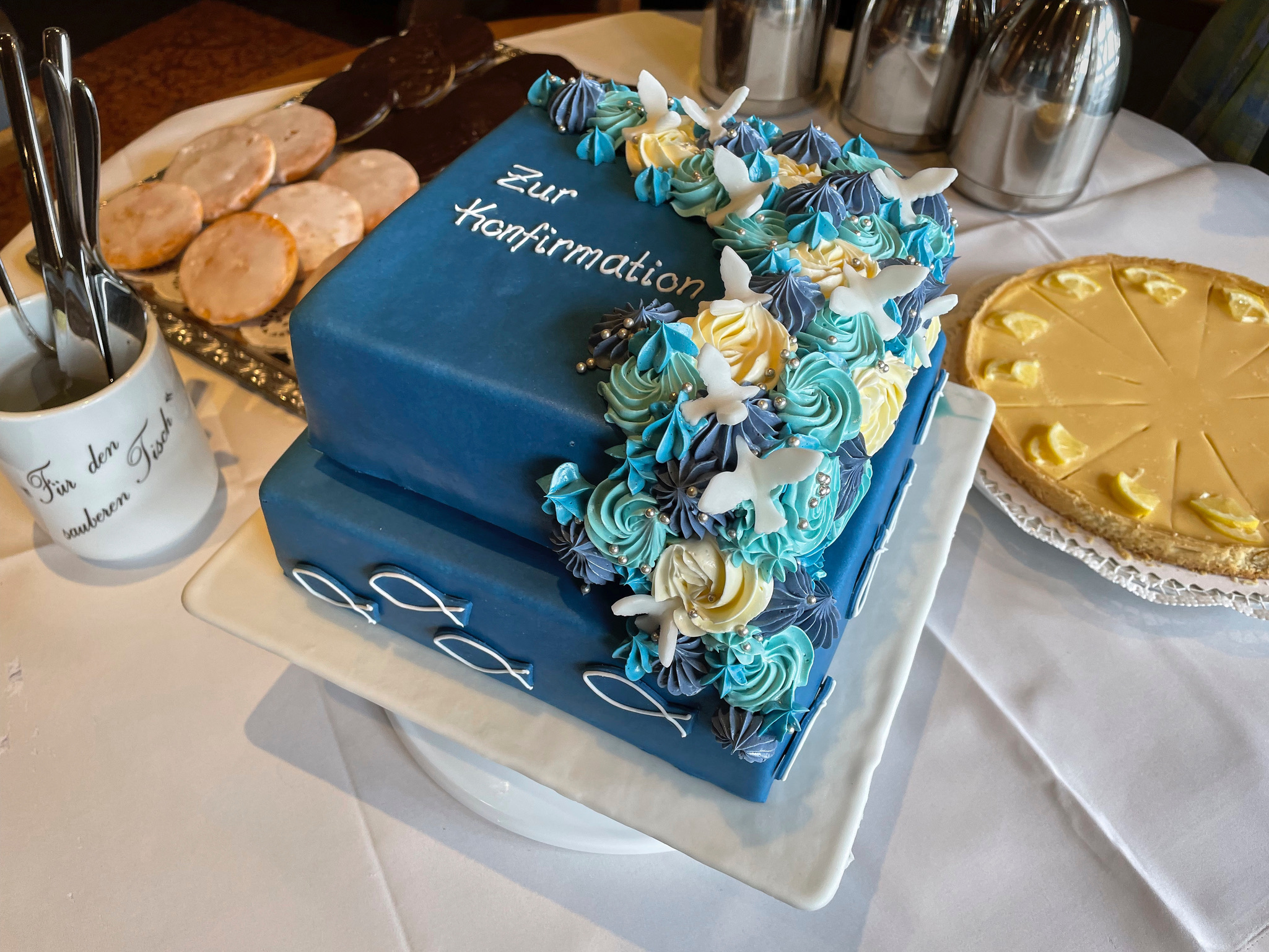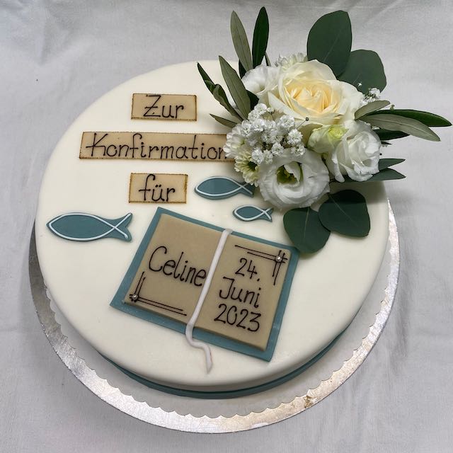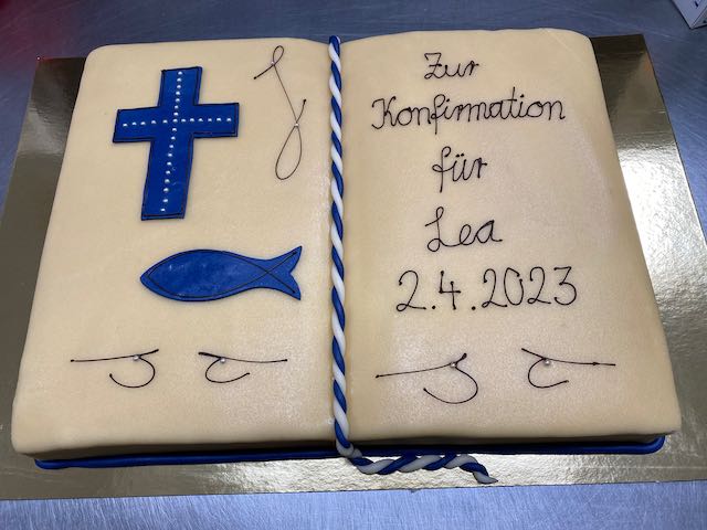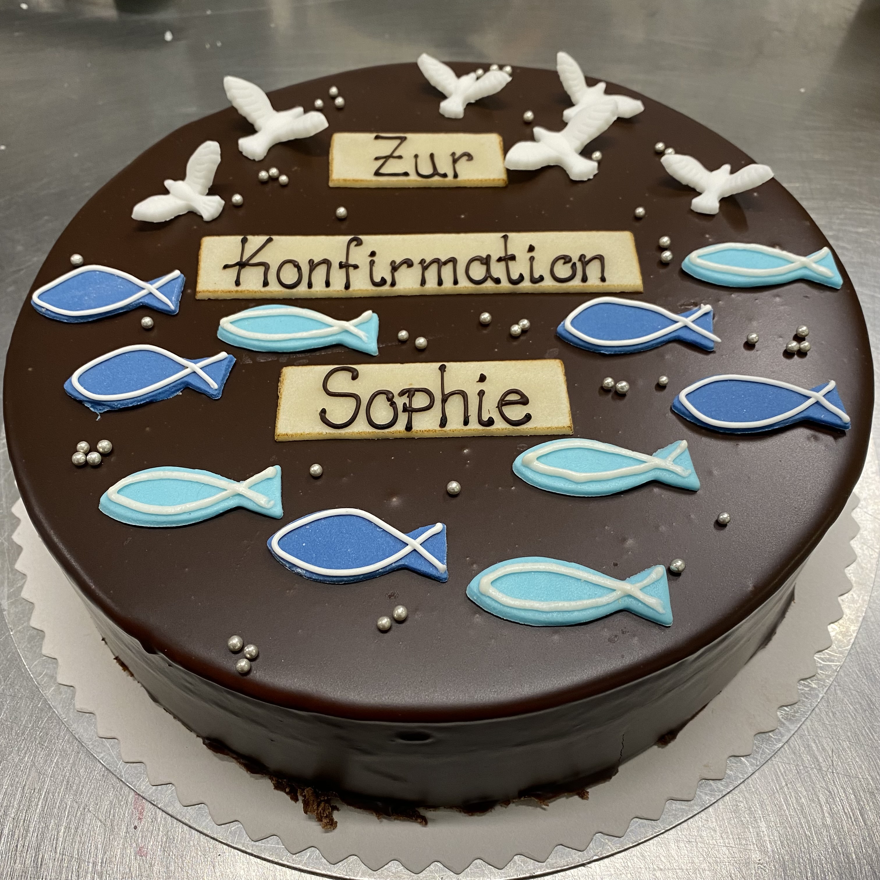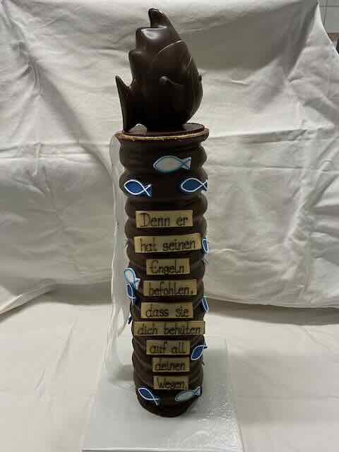 Ganzer Baumkuchen mit Kuvertüre überzogen und einem Fisch aus Kuvertüre als Aufsatz.