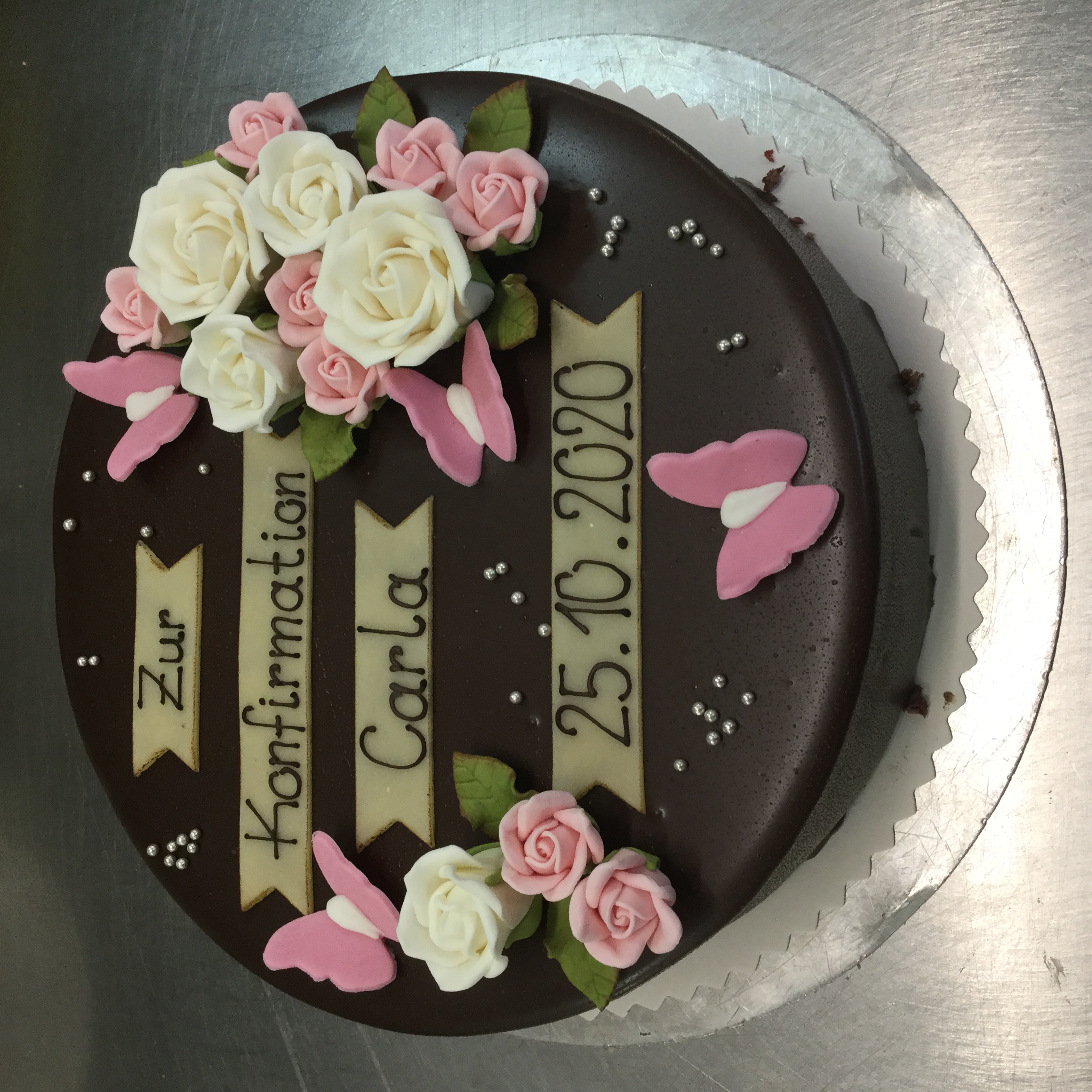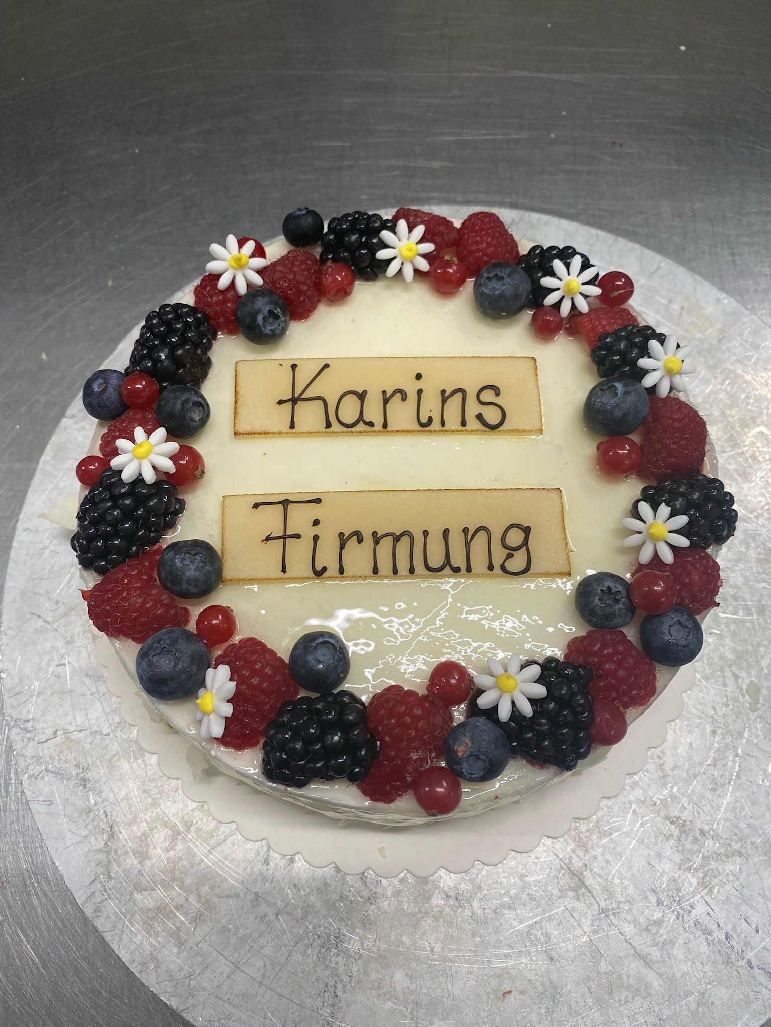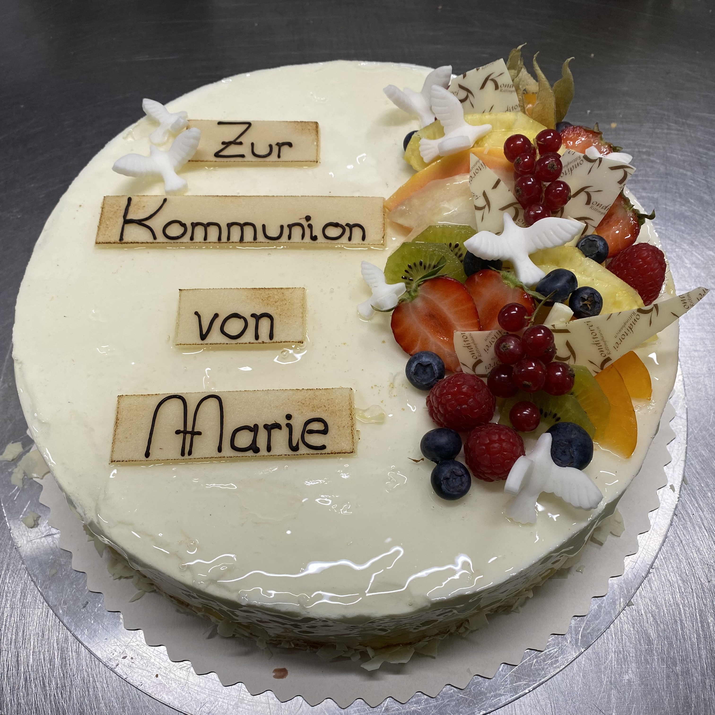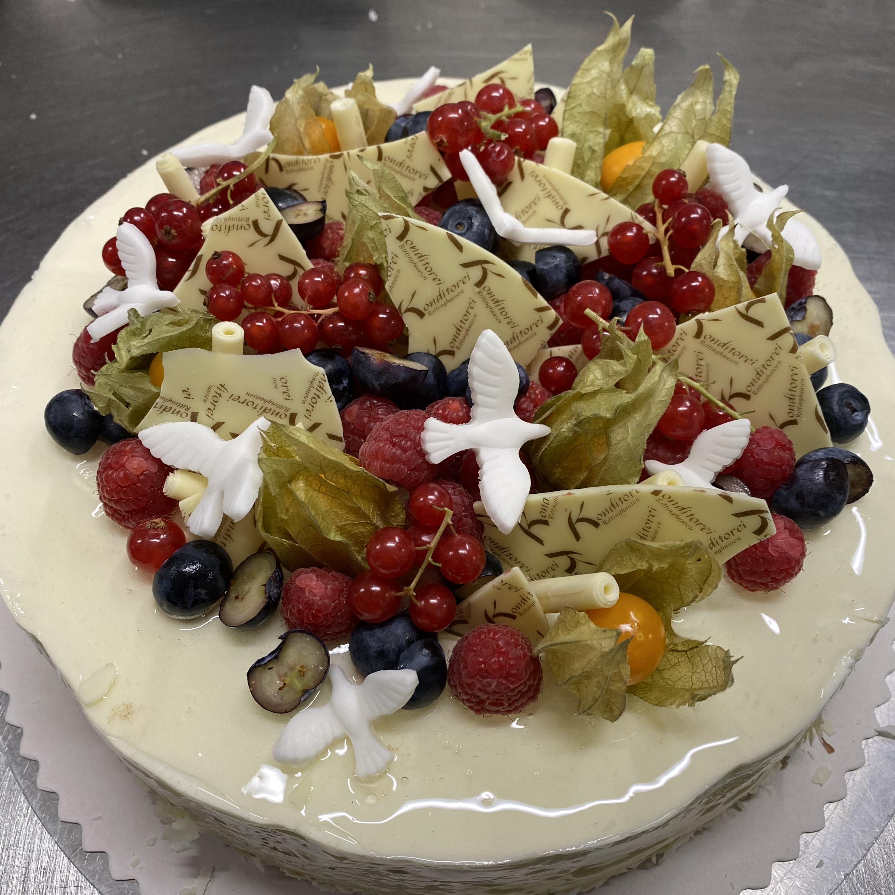 Maracuja-Joghurt Sahnetorte original mit Schriftband, Obstbouquet und weißen Tauben