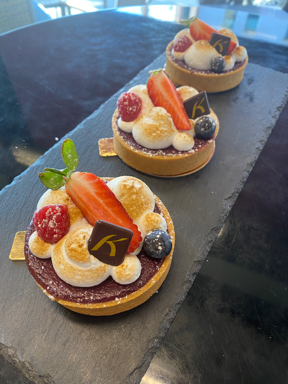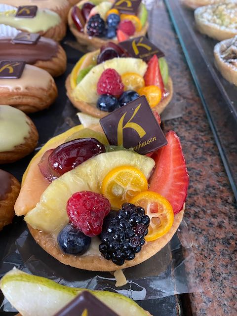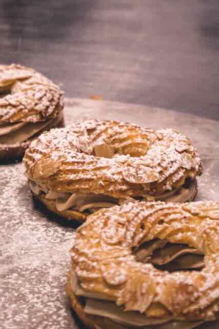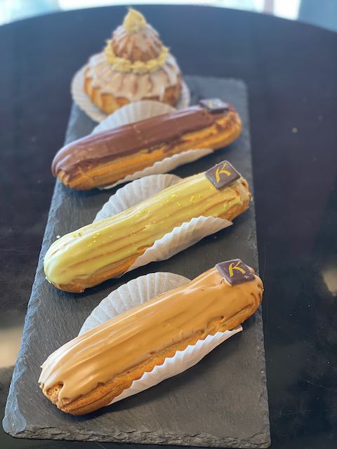 Selbstgemachte Brandmasse und feine, selbstgemachte Creme-Patissir in den Geschmacksrichtungen Schokolade (mit Equatoriale Noire von Valrhona), Kaffee und Pistazie sowie Pandan-Kokos. Gerne auch Vanille auf Vorbestellung.