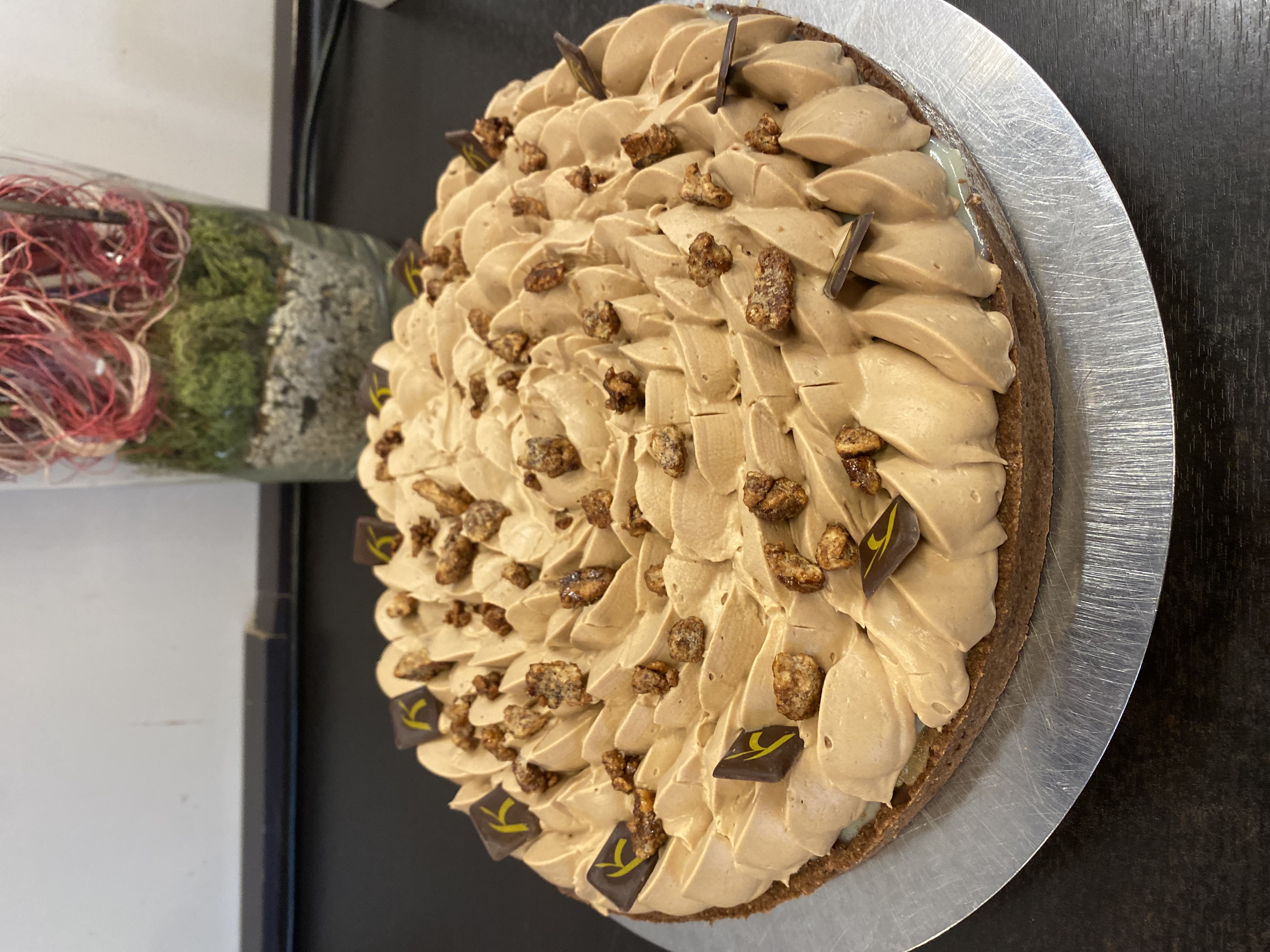 Mousse von Pecannuss-Praliné und Apfelkompott auf knusprigem Schokoladenmübeteig mit gebrannten Pecannüssen
