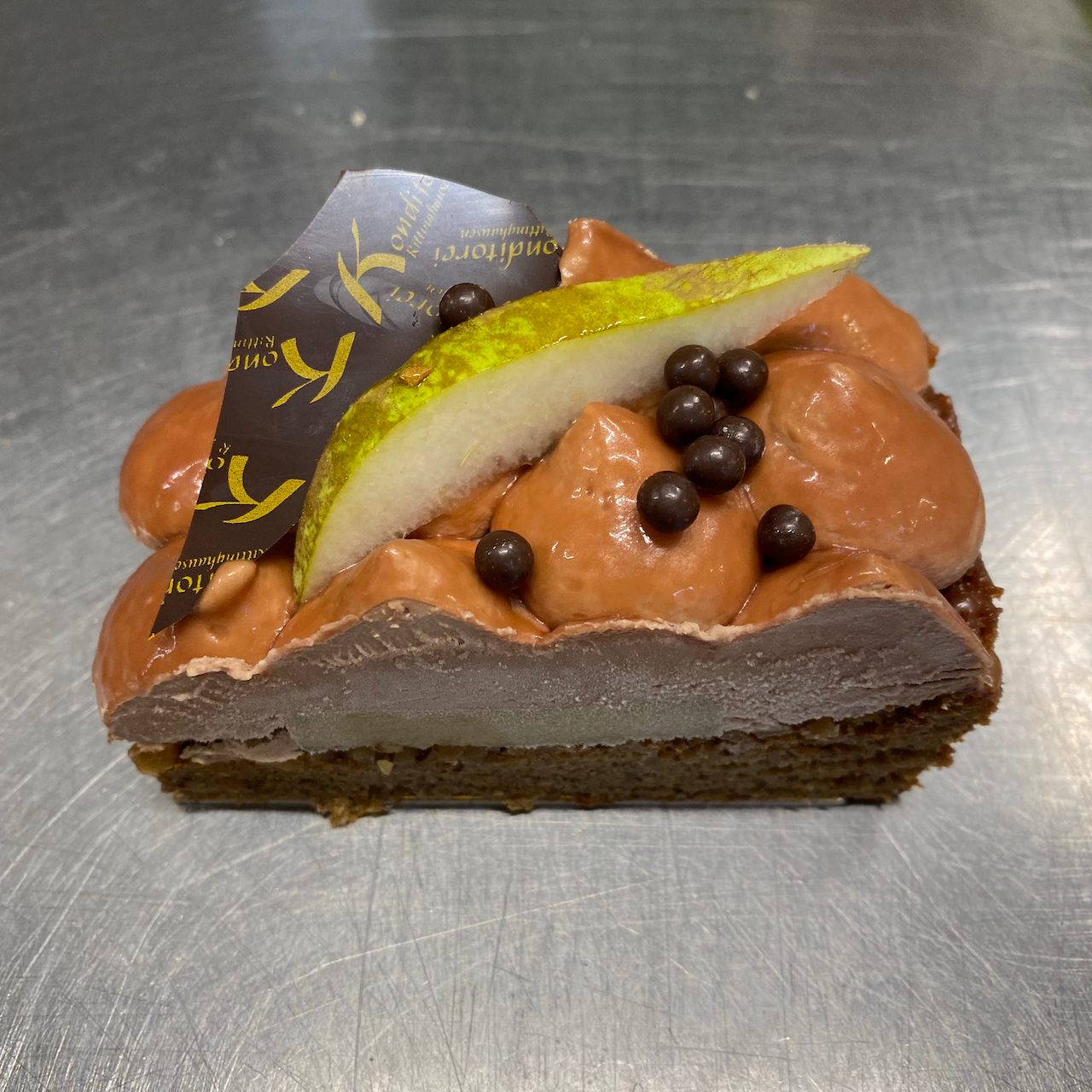 Zimtbiskuit ohne Mehl, Walnüsse, Birnenkonfit und Mousse von Valrhona Vollmilchschokolade. Eine Komposition geschaffen für den Herbst.