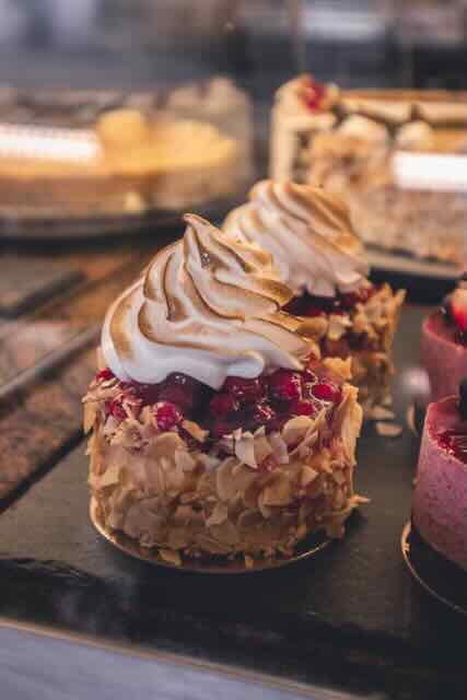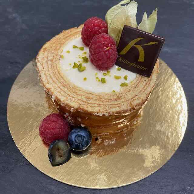 Rum-Vanillecreme, Biskuit, Himbeere, Marzipan und Kakaopulver